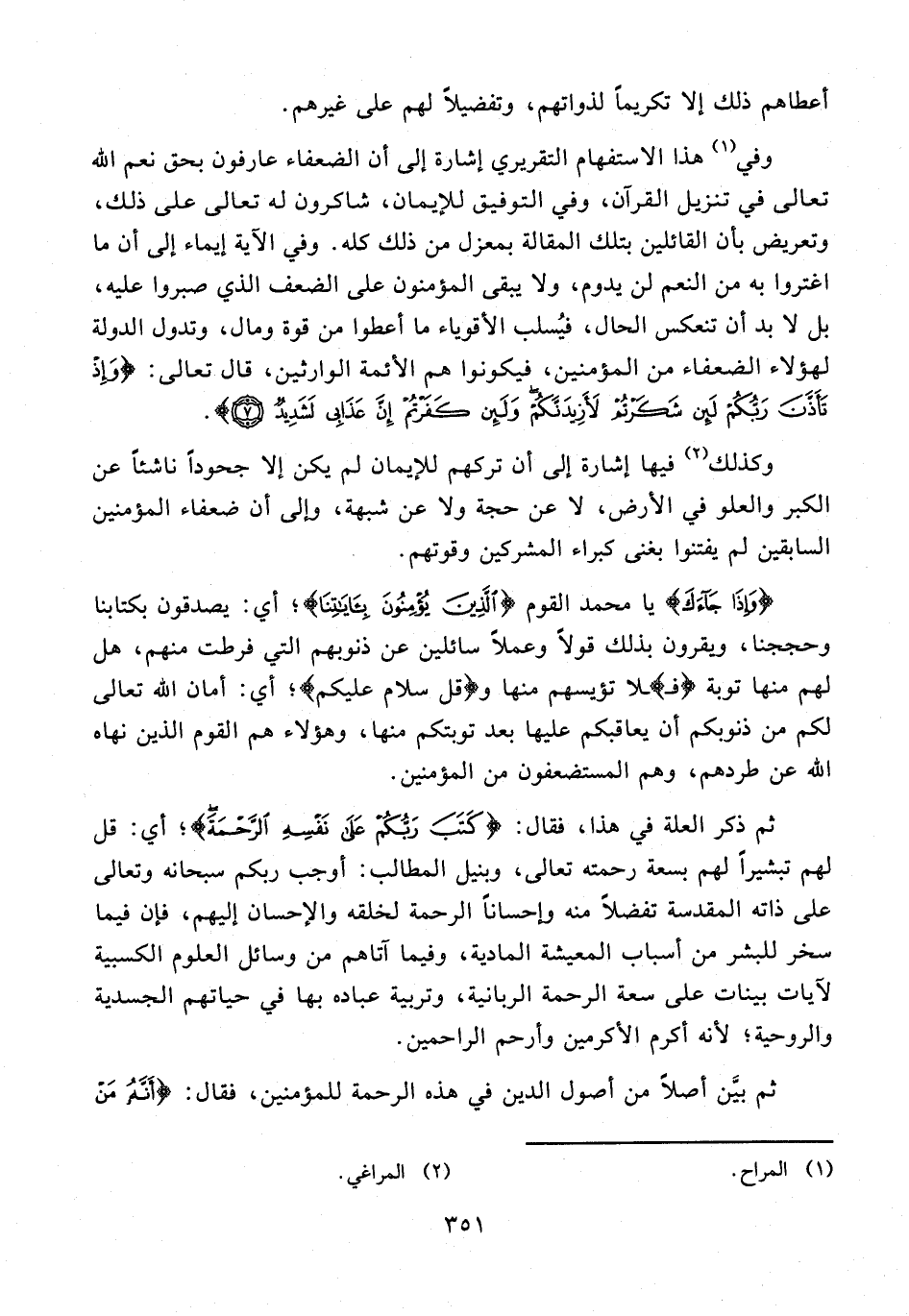 وفي (¬1) هذا الاستفهام التقريري إشارة إلى أن الضعفاء عارفون بحق نعم الله تعالى في تنزيل القرآن، وفي التوفيق للإيمان، شاكرون له تعالى على ذلك، وتعريض بأن القائلين بتلك المقالة بمعزل من ذلك كله. وفي الآية إيماء إلى أن ما اغتروا به من النعم لن يدوم، ولا يبقى المؤمنون على الضعف الذي صبروا عليه، بل لا بد أن تنعكس الحال، فيُسلب الأقوياء ما أعطوا من قوة ومال، وتدول الدولة لهؤلاء الضعفاء من المؤمنين، فيكونوا هم الأئمة الوارثين، قال تعالى: {وَإِذْ تَأَذَّنَ رَبُّكُمْ لَئِنْ شَكَرْتُمْ لَأَزِيدَنَّكُمْ وَلَئِنْ كَفَرْتُمْ إِنَّ عَذَابِي لَشَدِيدٌ (7)}.