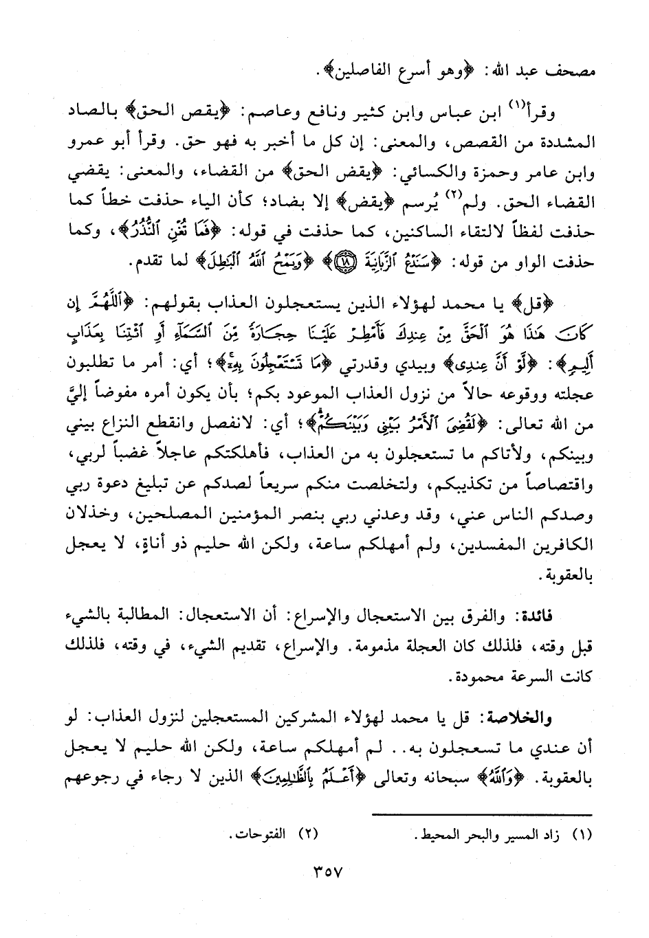 وقرأ (¬1) ابن عباس وابن كثير ونافع وعاصم: {يقص الحق} بالصاد المشددة من القصص، والمعنى: إن كل ما أخبر به فهو حق. وقرأ أبو عمرو وابن عامر وحمزة والكسائي: {يقض الحق} من القضاء، والمعنى: يقضي القضاء الحق. ولم (¬2) يُرسم {يقض} إلا بضاد؛ كأن الياء حذفت خطًّا كما حذفت لفظًا لالتقاء الساكنين، كما حذفت في قوله: {فَمَا تُغْنِ النُّذُرُ}، وكما حذفت الواو من قوله: {سَنَدْعُ الزَّبَانِيَةَ (18)} {وَيَمْحُ اللَّهُ الْبَاطِلَ} لما تقدم.