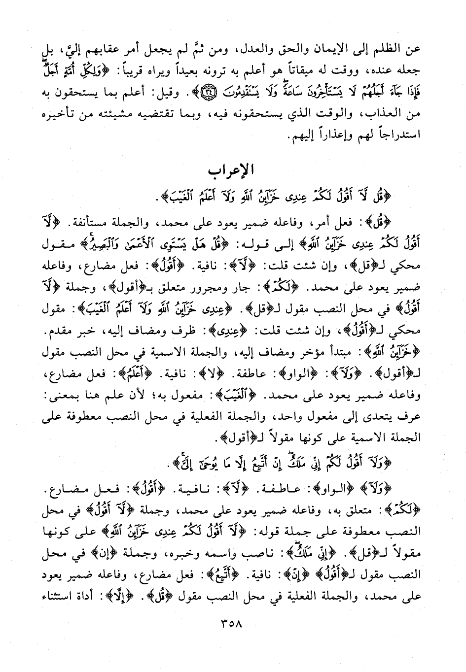 {وَلَا} {الواو}: عاطفة. {لَا}: نافية. {أَقُولُ}: فعل مضارع. {لَكُمْ}: متعلق به، وفاعله ضمير يعود على محمد، وجملة {لَا أَقُولُ} في محل النصب معطوفة على جملة قوله: {لَا أَقُولُ لَكُمْ عِنْدِي خَزَائِنُ اللَّهِ} على كونها مقولًا لـ {قل}. {إِنِّي مَلَكٌ}: ناصب واسمه وخبره، وجملة {إن} في محل النصب مقول لـ {أَقُولُ} {إن}: نافية. {أَتَّبِعُ}: فعل مضارع، وفاعله ضمير يعود على محمد، والجملة الفعلية في محل النصب مقول {قُلْ}. {إِلَّا}: أداة استثناء