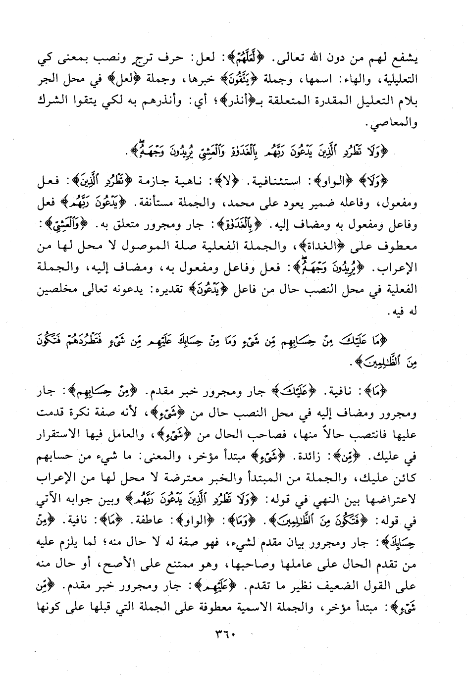 {وَلَا} {الواو}: استئنافية. {لا}: ناهية جازمة {تَطْرُدِ الَّذِينَ}: فعل ومفعول، وفاعله ضمير يعود على محمد، والجملة مستأنفة. {يَدْعُونَ رَبَّهُمْ} فعل وفاعل ومفعول به ومضاف إليه. {بِالْغَدَاةِ}: جار ومجرور متعلق به. {وَالْعَشِيِّ}: معطوف على {الغداة}، والجملة الفعلية صلة الموصول لا محل لها من الإعراب. {يُرِيدُونَ وَجْهَهُ}: فعل وفاعل ومفعول به، ومضاف إليه، والجملة الفعلية في محل النصب حال من فاعل {يَدْعُونَ} تقديره: يدعونه تعالى مخلصين له فيه.