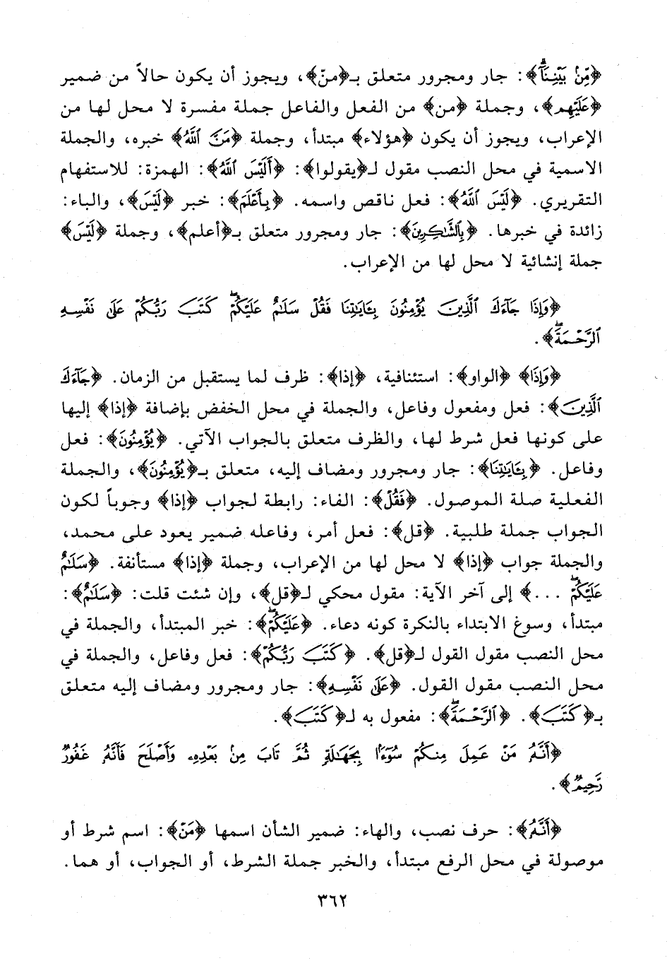 {وَإِذَا} {الواو}: استئنافية، {إذا}: ظرف لما يستقبل من الزمان. {جَاءَكَ الَّذِينَ}: فعل ومفعول وفاعل، والجملة في محل الخفض بإضافة {إذا} إليها على كونها فعل شرط لها، والظرف متعلق بالجواب الآتي. {يُؤْمِنُونَ}: فعل وفاعل. {بِآيَاتِنَا}: جار ومجرور ومضاف إليه، متعلق بـ {يُؤْمِنُونَ}، والجملة الفعلية صلة الموصول. {فَقُلْ}: الفاء: رابطة لجواب {إذا} وجوبًا لكون الجواب جملة طلبية. {قل}: فعل أمر، وفاعله ضمير يعود على محمد، والجملة جواب {إذا} لا محل لها من الإعراب، وجملة {إذا} مستأنفة. {سَلَامٌ عَلَيْكُمْ ...} إلى آخر الآية: مقول محكي لـ {قل}، وإن شئت قلت: {سَلَامٌ}: مبتدأ، وسوغ الابتداء بالنكرة كونه دعاء. {عَلَيْكُمْ}: خبر المبتدأ، والجملة في محل النصب مقول القول لـ {قل}. {كَتَبَ رَبُّكُمْ}: فعل وفاعل، والجملة في محل النصب مقول القول. {عَلَى نَفْسِهِ}: جار ومجرور ومضاف إليه متعلق بـ {كَتَبَ}. {الرَّحْمَةَ}: مفعول به لـ {كَتبَ}.