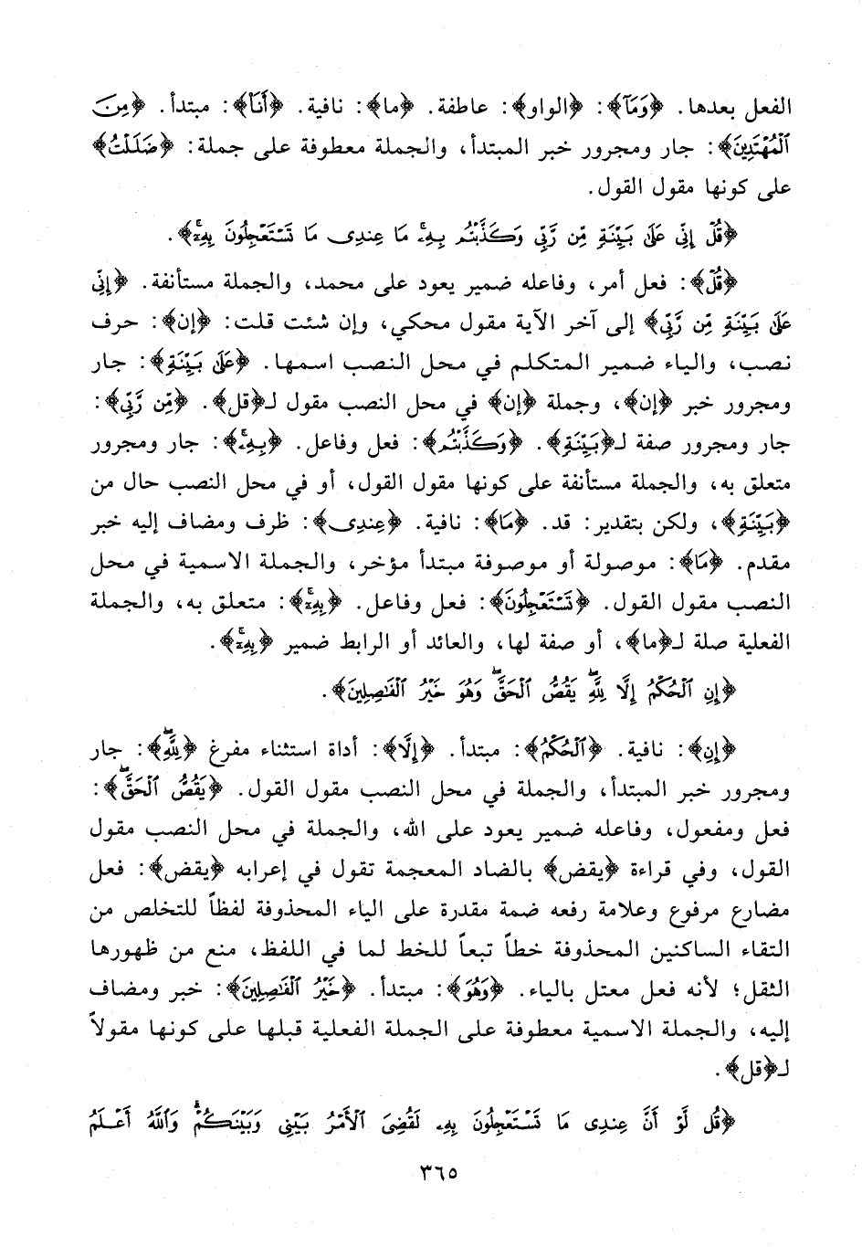 {قُلْ}: فعل أمر، وفاعله ضمير يعود على محمد، والجملة مستأنفة. {إِنِّي عَلَى بَيِّنَةٍ مِنْ رَبِّي} إلى آخر الآية مقول محكي، وإن شئت قلت: {إن}: حرف نصب، والياء ضمير المتكلم في محل النصب اسمها. {عَلَى بَيِّنَةٍ}: جار ومجرور خبر {إن}، وجملة {إن} في محل النصب مقول لـ {قل}. {مِنْ رَبِّي}: جار ومجرور صفة لـ {بَيِّنَةٍ}. {وَكَذَّبْتُمْ}: فعل وفاعل. {بِهِ}: جار ومجرور متعلق به، والجملة مستأنفة على كونها مقول القول، أو في محل النصب حال من {بَيِّنَةٍ}، ولكن بتقدير: قد. {مَا}: نافية. {عِنْدِي}: ظرف ومضاف إليه خبر مقدم. {مَا}: موصولة أو موصوفة مبتدأ مؤخر، والجملة الإسمية في محل النصب مقول القول. {تَسْتَعْجِلُونَ}: فعل وفاعل. {بِهِ}: متعلق به، والجملة الفعلية صلة لـ {ما}، أو صفة لها، والعائد أو الرابط ضمير {بِهِ}.
