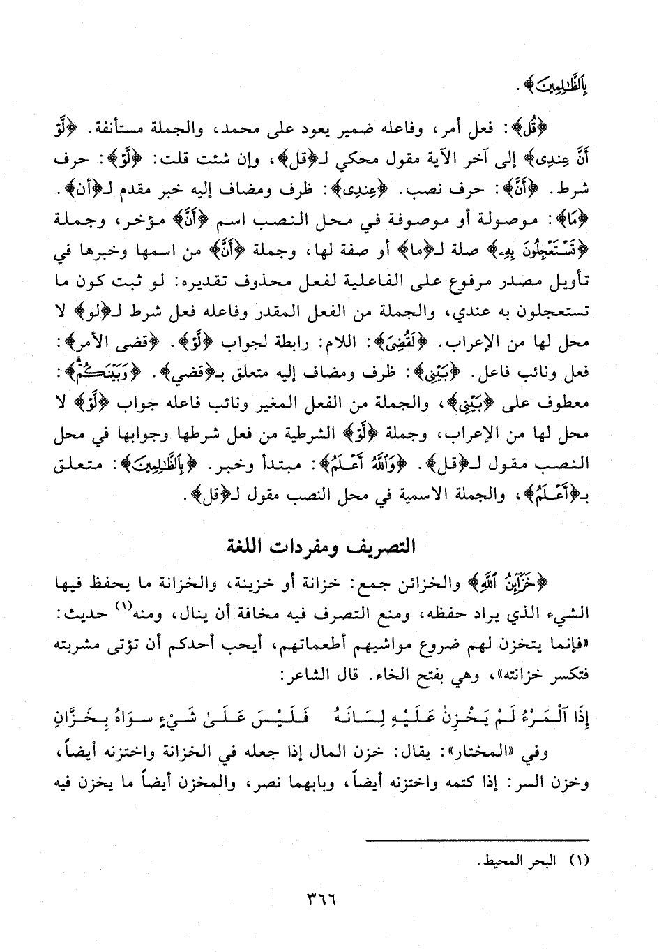 {قُلْ}: فعل أمر، وفاعله ضمير يعود على محمد، والجملة مستأنفة. {لَوْ أَنَّ عِنْدِي} إلى آخر الآية مقول محكي لـ {قل}، وإن شئت قلت: {لَوْ}: حرف شرط. {أَنَّ}: حرف نصب. {عِنْدِى}: ظرف ومضاف إليه خبر مقدم لـ {أن}. {مَا}: موصولة أو موصوفة في محل النصب اسم {أَنَّ} مؤخر، وجملة {تَسْتَعْجِلُونَ بِهِ} صلة لـ {ما} أو صفة لها، وجملة {أَنَّ} من اسمها وخبرها في تأويل مصدر مرفوع على الفاعلية لفعل محذوف تقديره: لو ثبت كون ما تستعجلون به عندي، والجملة من الفعل المقدر وفاعله فعل شرط لـ {لو} لا محل لها من الإعراب. {لَقُضِيَ}: اللام: رابطة لجواب {لَوْ}. {قضى الأمر}: فعل ونائب فاعل. {بَيْنِي}: ظرف ومضاف إليه متعلق بـ {قضي}. {وَبَيْنَكُمْ}: معطوف على {بَيْنِي}، والجملة من الفعل المغير ونائب فاعله جواب {لَوْ} لا محل لها من الإعراب، وجملة {لَوْ} الشرطية من فعل شرطها وجوابها في محل النصب مقول لـ {قل}. {وَاللَّهُ أَعْلَمُ}: مبتدأ وخبر. {بِالظَّالِمِينَ}: متعلق بـ {أَعلَمُ}، والجملة الإسمية في محل النصب مقول لـ {قل}.
