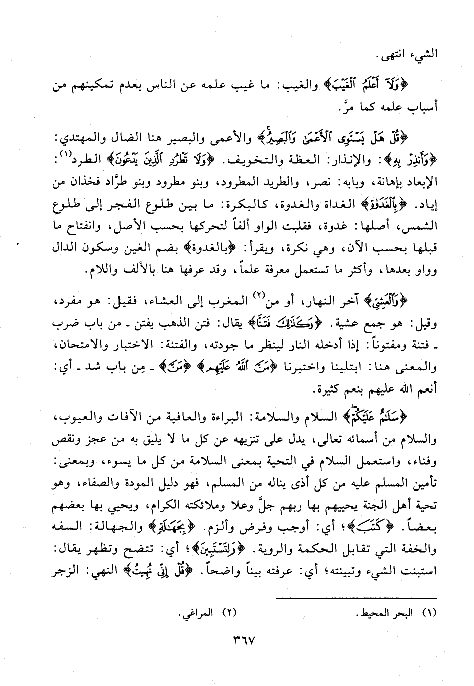{قُلْ هَلْ يَسْتَوِي الْأَعْمَى وَالْبَصِيرُ} والأعمى والبصير هنا الضال والمهتدي: {وَأَنْذِرْ بِهِ}: والإنذار: العظة والتخويف. {وَلَا تَطْرُدِ الَّذِينَ يَدْعُونَ} الطرد (¬1): الإبعاد بإهانة، وبابه: نصر، والطريد المطرود، وبنو مطرود وبنو طرَّاد فخذان من إياد. {بِالْغَدَاةِ} الغداة والغدوة، كالبكرة: ما بين طلوع الفجر إلى طلوع الشمس، أصلها: غدوة، فقلبت الواو ألفًا لتحركها بحسب الأصل، وانفتاح ما قبلها بحسب الآن، وهي نكرة، ويقرأ: {بالغدوة} بضم الغين وسكون الدال وواو بعدها، وأكثر ما تستعمل معرفة علمًا، وقد عرفها هنا بالألف واللام.