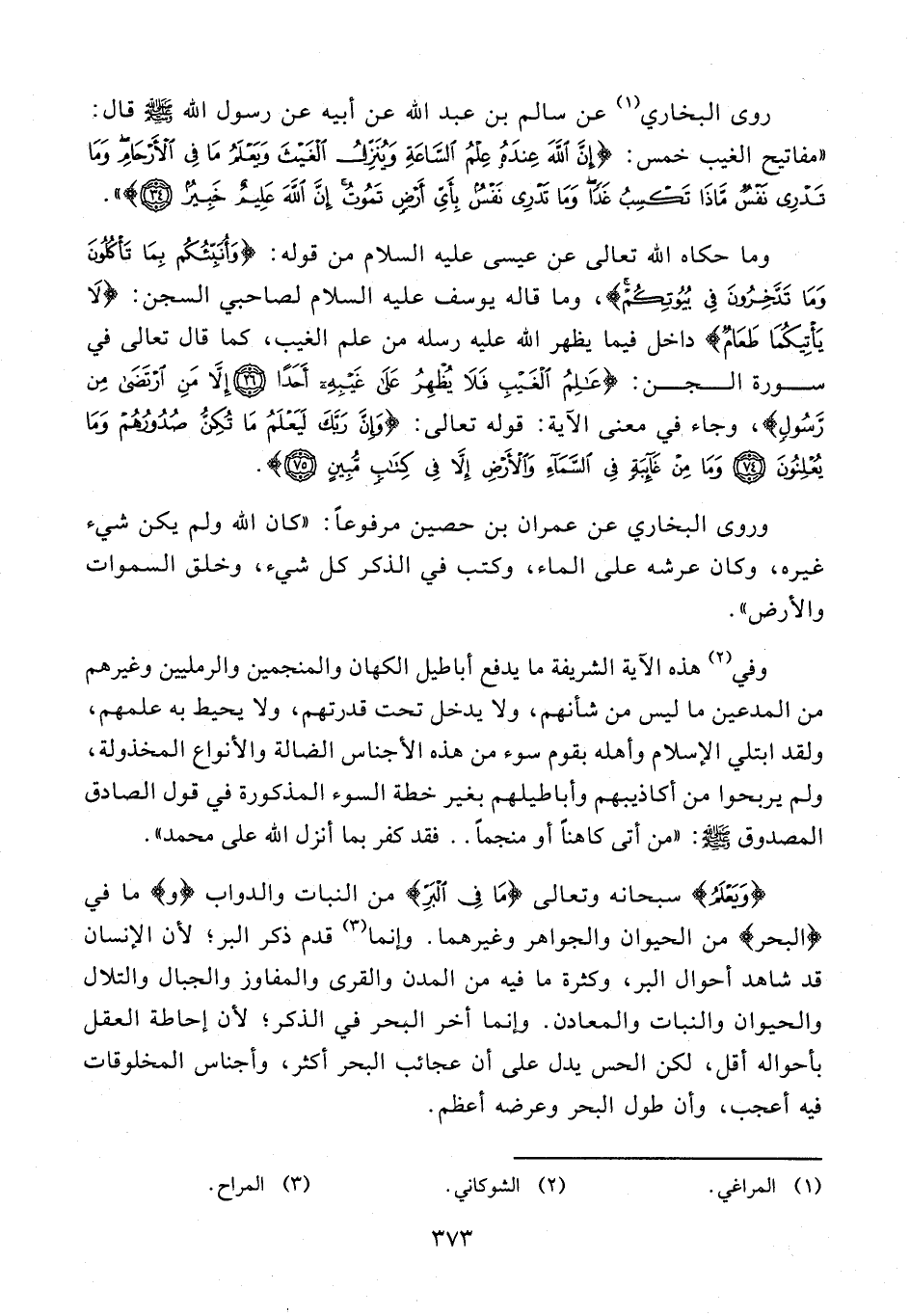 روى البخاري (¬1) عن سالم بن عبد الله عن أبيه عن رسول الله - صلى الله عليه وسلم - قال: "مفاتيح الغيب خمس: {إِنَّ اللَّهَ عِنْدَهُ عِلْمُ السَّاعَةِ وَيُنَزِّلُ الْغَيْثَ وَيَعْلَمُ مَا فِي الْأَرْحَامِ وَمَا تَدْرِي نَفْسٌ مَاذَا تَكْسِبُ غَدًا وَمَا تَدْرِي نَفْسٌ بِأَيِّ أَرْضٍ تَمُوتُ إِنَّ اللَّهَ عَلِيمٌ خَبِيرٌ (34)} ".