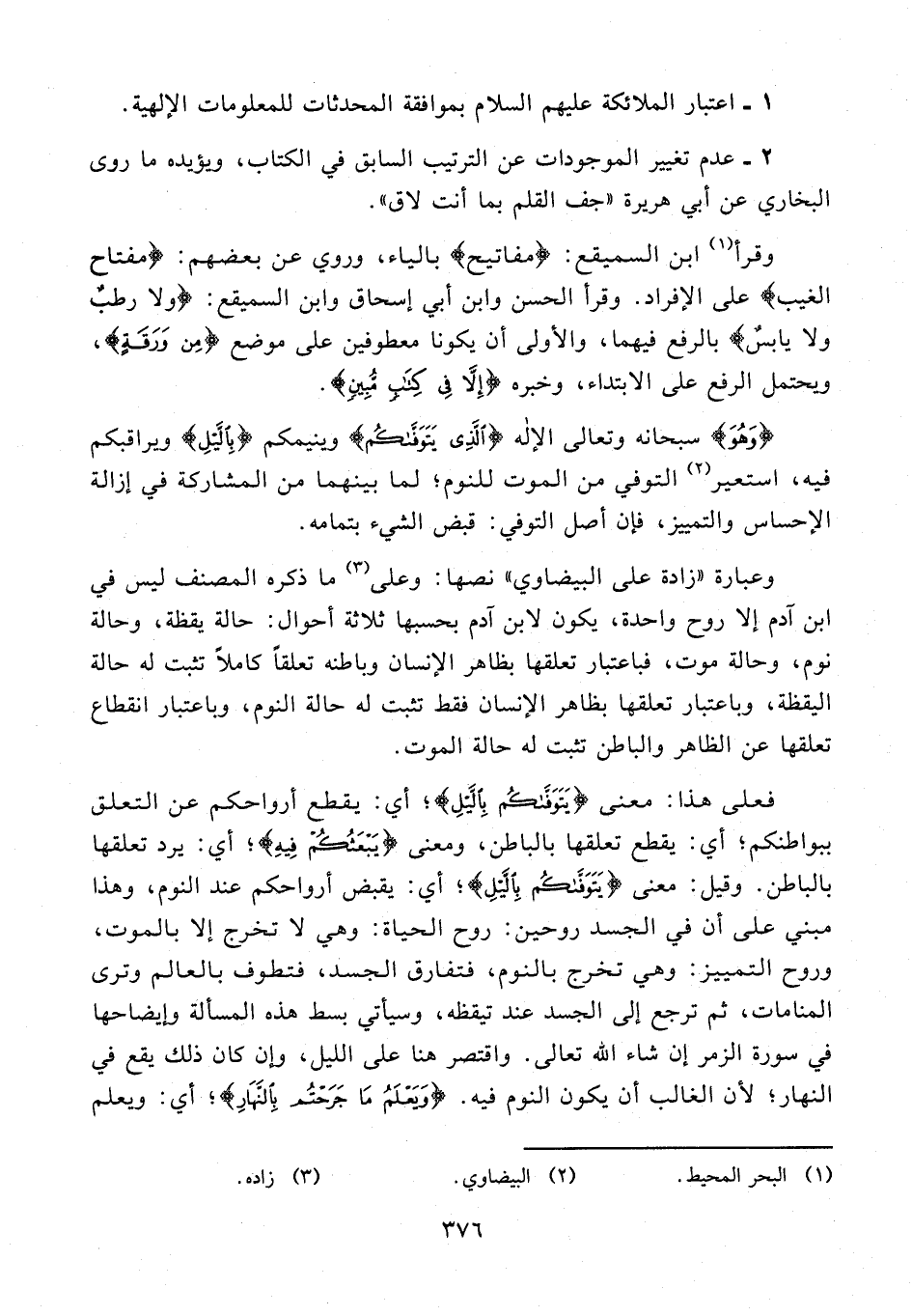 وعبارة "زادة على البيضاوي" نصها: وعلى (¬3) ما ذكره المصنف ليس في ابن آدم إلا روح واحدة، يكون لابن آدم بحسبها ثلاثة أحوال: حالة يقظة، وحالة نوم، وحالة موت، فباعتبار تعلقها بظاهر الإنسان وباطنه تعلقًا كاملًا تثبت له حالة اليقظة، وباعتبار تعلقها بظاهر الإنسان فقط تثبت له حالة النوم، وباعتبار انقطاع تعلقها عن الظاهر والباطن تثبت له حالة الموت.