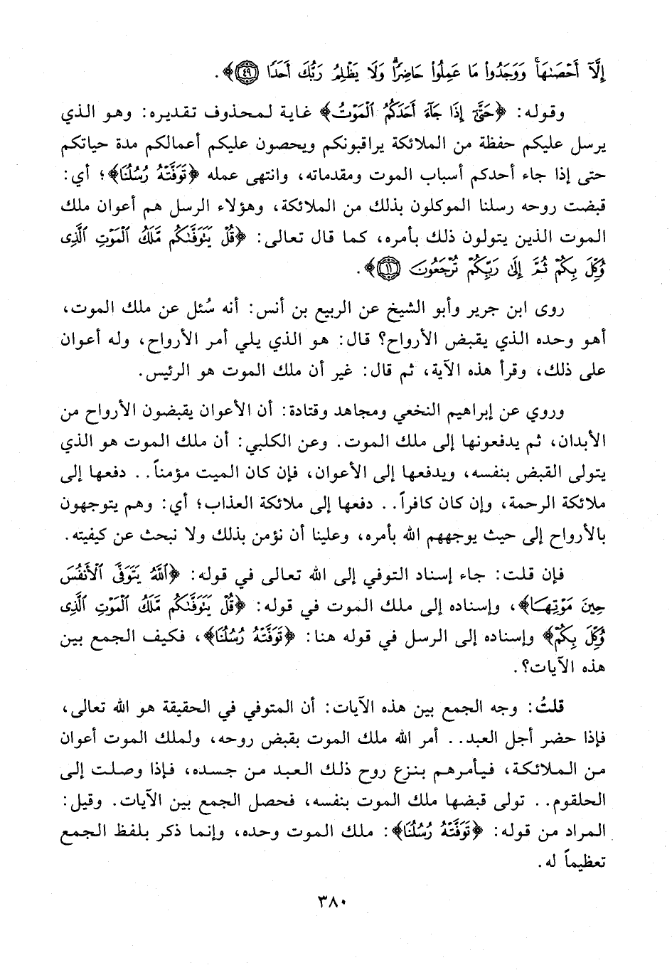 قلتُ: وجه الجمع بين هذه الآيات: أن المتوفي في الحقيقة هو الله تعالى، فإذا حضر أجل العبد .. أمر الله ملك الموت بقبض روحه، ولملك الموت أعوان من الملائكة، فيأمرهم بنزع روح ذلك العبد من جسده، فإذا وصلت إلى الحلقوم .. تولى قبضها ملك الموت بنفسه، فحصل الجمع بين الآيات. وقيل: المراد من قوله: {تَوَفَّتْهُ رُسُلُنَا}: ملك الموت وحده، وإنما ذكر بلفظ الجمع تعظيمًا له.
