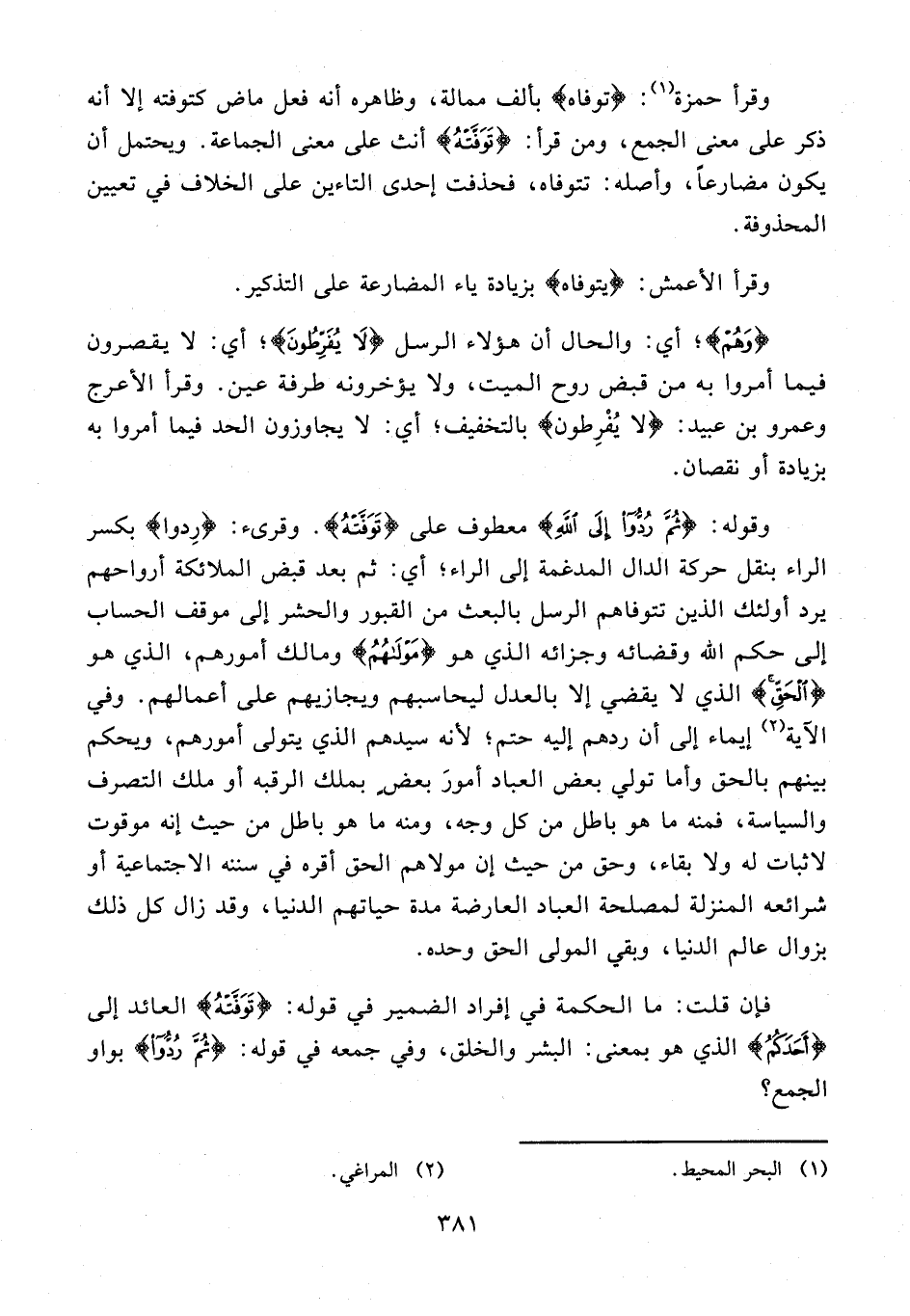فإن قلت: ما الحكمة في إفراد الضمير في قوله: {تَوَفَّتْهُ} العائد إلى {أَحَدَكُمُ} الذي هو بمعنى: البشر والخلق، وفي جمعه في قوله: {ثُمَّ رُدُّوا} بواو الجمع؟