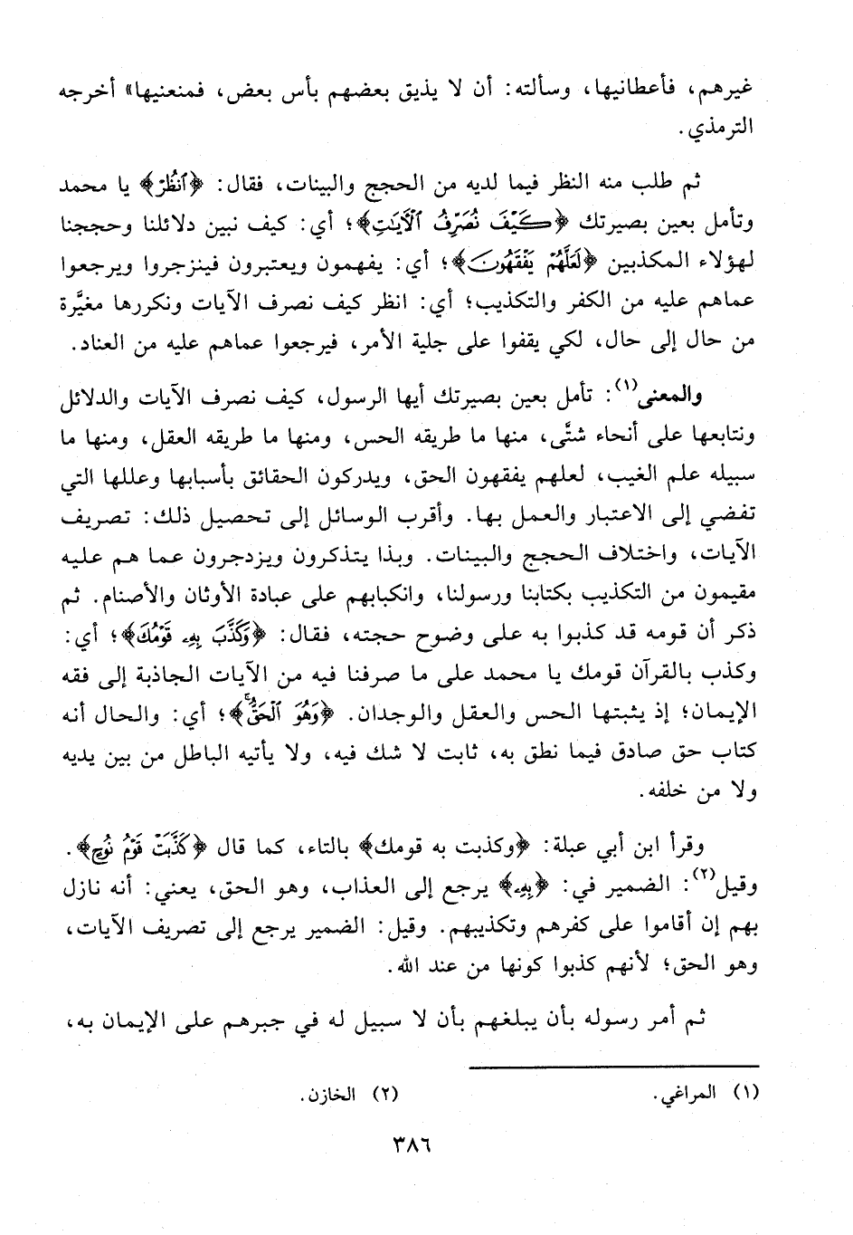 ثم طلب منه النظر فيما لديه من الحجج والبينات، فقال: {انْظُرْ} يا محمَّد وتأمل بعين بصيرتك {كَيْفَ نُصَرِّفُ الْآيَاتِ}؛ أي: كيف نبين دلائلنا وحججنا لهؤلاء المكذبين {لَعَلَّهُمْ يَفْقَهُونَ}؛ أي: يفهمون ويعتبرون فينزجروا ويرجعوا عماهم عليه من الكفر والتكذيب؛ أي: انظر كيف نصرف الآيات ونكررها مغيَّرة من حال إلى حال، لكي يقفوا على جلية الأمر، فيرجعوا عما هم عليه من العناد.