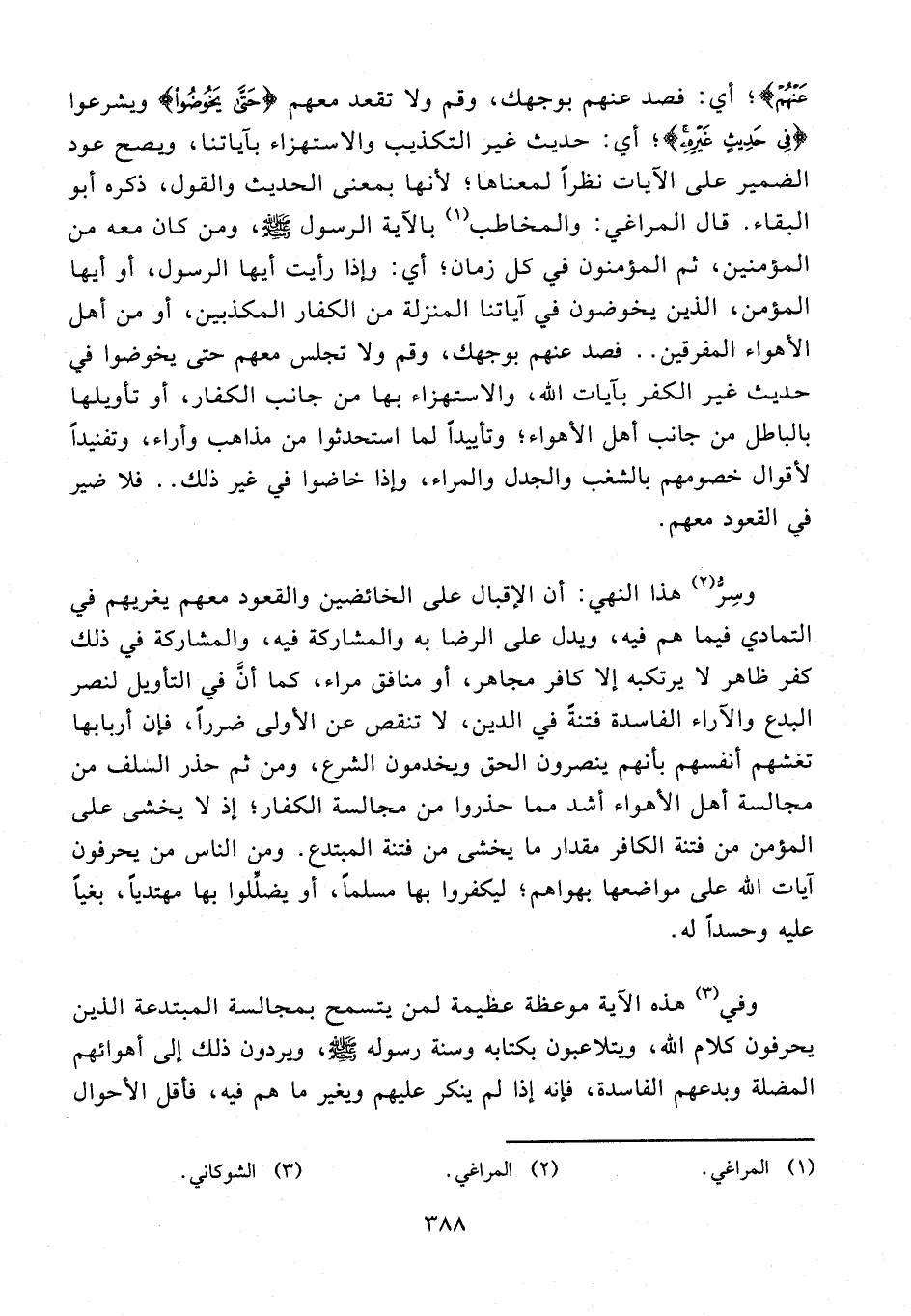 وسِرُّ (¬2) هذا النهي: أن الإقبال على الخائضين والقعود معهم يغريهم في التمادي فيما هم فيه، ويدل على الرضا به والمشاركة فيه، والمشاركة في ذلك كفر ظاهر لا يرتكبه إلا كافر مجاهر، أو منافق مراء، كما أنَّ في التأويل لنصر البدع والآراء الفاسدة فتنةً في الدين، لا تنقص عن الأولى ضررًا، فإن أربابها تغشهم أنفسهم بأنهم ينصرون الحق ويخدمون الشرع، ومن ثم حذر السلف من مجالسة أهل الأهواء أشد مما حذروا من مجالسة الكفار؛ إذ لا يخشى على المؤمن من فتنة الكافر مقدار ما يخشى من فتنة المبتدع. ومن الناس من يحرفون آيات الله على مواضعها بهواهم؛ ليكفروا بها مسلمًا، أو يضلِّلوا بها مهتديًا، بغيًا عليه وحسدًا له.