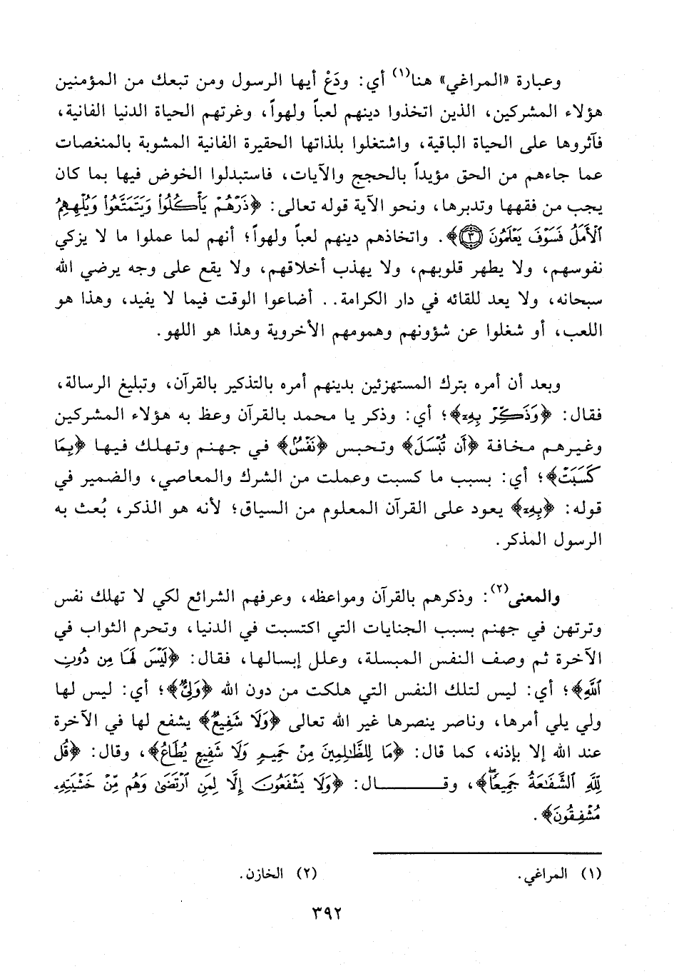 وعبارة "المراغي" هنا (¬1) أي: ودَعْ أيها الرسول ومن تبعك من المؤمنين هؤلاء المشركين، الذين اتخذوا دينهم لعبًا ولهوًا، وغرتهم الحياة الدنيا الفانية، فآثروها على الحياة الباقية، واشتغلوا بلذاتها الحقيرة الفانية المشوبة بالمنغصات عما جاءهم من الحق مؤيدًا بالحجج والآيات، فاستبدلوا الخوض فيها بما كان يجب من فقهها وتدبرها، ونحو الآية قوله تعالى: {ذَرْهُمْ يَأْكُلُوا وَيَتَمَتَّعُوا وَيُلْهِهِمُ الْأَمَلُ فَسَوْفَ يَعْلَمُونَ (3)}. واتخاذهم دينهم لعبًا ولهوًا؛ أنهم لما عملوا ما لا يزكي نفوسهم، ولا يطهر قلوبهم، ولا يهذب أخلاقهم، ولا يقع على وجه يرضي الله سبحانه، ولا يعد للقائه في دار الكرامة .. أضاعوا الوقت فيما لا يفيد، وهذا هو اللعب، أو شغلوا عن شؤونهم وهمومهم الأخروية وهذا هو اللهو.
