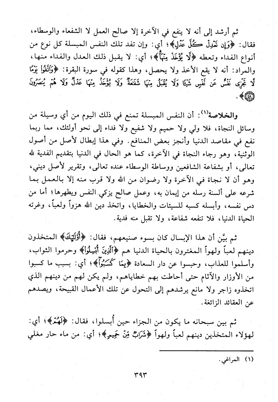 والخلاصة (¬1): أن النفس المبسلة تمنع في ذلك اليوم من أي وسيلة من وسائل النجاة، فلا ولي ولا حميم ولا شفيع ولا فداء إلى نحو أولئك، مما ربما نفع في مقاصد الدنيا وأنجز بعض المنافع. وفي هذا إبطال لأصل من أصول الوثنية، وهو رجاء النجاة في الآخرة، كما هو الحال في الدنيا بتقديم الفدية لله تعالى، أو بشفاعة الشافعين ووساطة الوسطاء عنده تعالى، وتقرير لأصل ديني، وهو أن لا نجاة في الآخرة ولا رضوان من الله ولا قرب منه إلا بالعمل بما شرعه على ألسنة رسله من إيمان به، وعمل صالح يزكي النفس ويطهرها؛ أما من دس نفسه، وأبسله كسبه للسيئات والخطايا، واتخذ دين الله هزوًا ولعبًا، وغرته الحياة الدنيا، فلا تنفعه شفاعة، ولا تقبل منه فدية.
