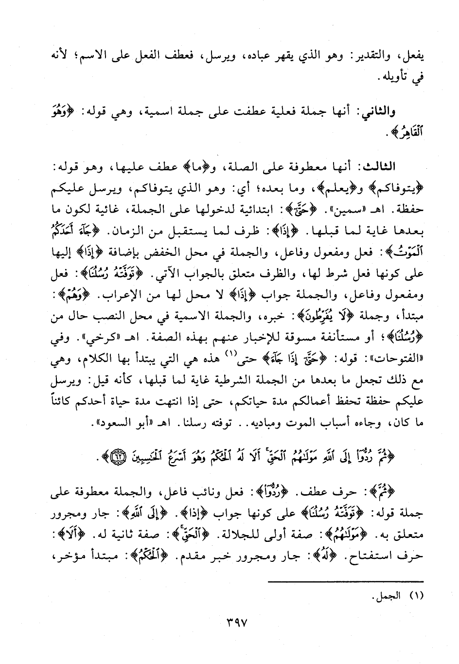 الثالث: أنها معطوفة على الصلة، و {مَا} عطف عليها، وهو قوله: {يَتَوَفَّاكُمْ} و {يَعْلَمُ}، وما بعده؛ أي: وهو الذي يتوفاكم، ويرسل عليكم حفظة. اهـ "سمين". {حَتَّى}: ابتدائية لدخولها على الجملة، غائية لكون ما بعدها غاية لما قبلها. {إِذَا}: ظرف لما يستقبل من الزمان. {جَاءَ أَحَدَكُمُ الْمَوْتُ}: فعل ومفعول وفاعل، والجملة في محل الخفض بإضافة {إِذَا} إليها على كونها فعل شرط لها، والظرف متعلق بالجواب الآتي. {تَوَفَّتْهُ رُسُلُنَا}: فعل ومفعول وفاعل، والجملة جواب {إِذَا} لا محل لها من الإعراب. {وَهُمْ}: مبتدأ، وجملة {لَا يُفَرِّطُونَ}: خبره، والجملة الإسمية في محل النصب حال من {رُسُلُنَا}؛ أو مستأنفة مسوقة للإخبار عنهم بهذه الصفة. اهـ "كرخي". وفي "الفتوحات": قوله: {حَتَّى إِذَا جَاءَ} حتى (¬1) هذه هي التي يبتدأ بها الكلام، وهي مع ذلك تجعل ما بعدها من الجملة الشرطية غاية لما قبلها، كأنه قيل: ويرسل عليكم حفظة تحفظ أعمالكم مدة حياتكم، حتى إذا انتهت مدة حياة أحدكم كائنًا ما كان، وجاءه أسباب الموت ومباديه .. توفته رسلنا. اهـ "أبو السعود".