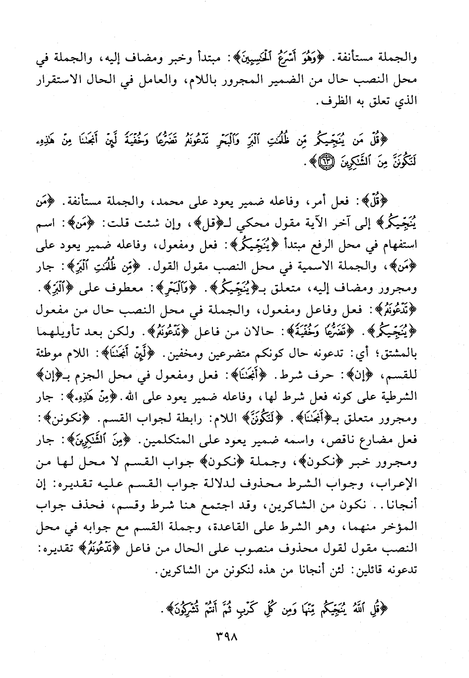 {قُلْ}: فعل أمر، وفاعله ضمير يعود على محمَّد، والجملة مستأنفة. {مَنْ يُنَجِّيكُمْ} إلى آخر الآية مقول محكي لـ {قُلْ}، وإن شئت قلت: {مَنْ}: اسم استفهام في محل الرفع مبتدأ {يُنَجِّيكُمْ}: فعل ومفعول، وفاعله ضمير يعود على {مِنْ}، والجملة الإسمية في محل النصب مقول القول. {مِنْ ظُلُمَاتِ الْبَرِّ}: جار ومجرور ومضاف إليه، متعلق بـ {يُنَجِّيكُمْ}. {وَالْبَحْرِ}: معطوف على {الْبَرِّ}. {تَدْعُونَهُ}: فعل وفاعل ومفعول، والجملة في محل النصب حال من مفعول {يُنَجِّيكُمْ}. {تَضَرُّعًا وَخُفْيَةً}: حالان من فاعل {تَدْعُونَهُ}. ولكن بعد تأويلهما بالمشتق؛ أي: تدعونه حال كونكم متضرعين ومخفين. {لَئِنْ أَنْجَانَا}: اللام موطئة للقسم، {إن}: حرف شرط. {أَنْجَانَا}: فعل ومفعول في محل الجزم بـ {إن} الشرطية على كونه فعل شرط لها، وفاعله ضمير يعود على الله. {مِنْ هَذِهِ}: جار ومجرور متعلق بـ {أَنْجَانَا}. {لَنَكُونَنَّ} اللام: رابطة لجواب القسم. {نَكُونَنَّ}: فعل مضارع ناقص، واسمه ضمير يعود على المتكلمين. {مِنَ الشَّاكِرِينَ}: جار ومجرور خبر {نكون}، وجملة {نكون} جواب القسم لا محل لها من الإعراب، وجواب الشرط محذوف لدلالة جواب القسم عليه تقديره: إن أنجانا .. نكون من الشاكرين، وقد اجتمع هنا شرط وقسم، فحذف جواب المؤخر منهما، وهو الشرط على القاعدة، وجملة القسم مع جوابه في محل النصب مقول لقول محذوف منصوب على الحال من فاعل {تَدْعُونَهُ} تقديره: تدعونه قائلين: لئن أنجانا من هذه لنكونن من الشاكرين.