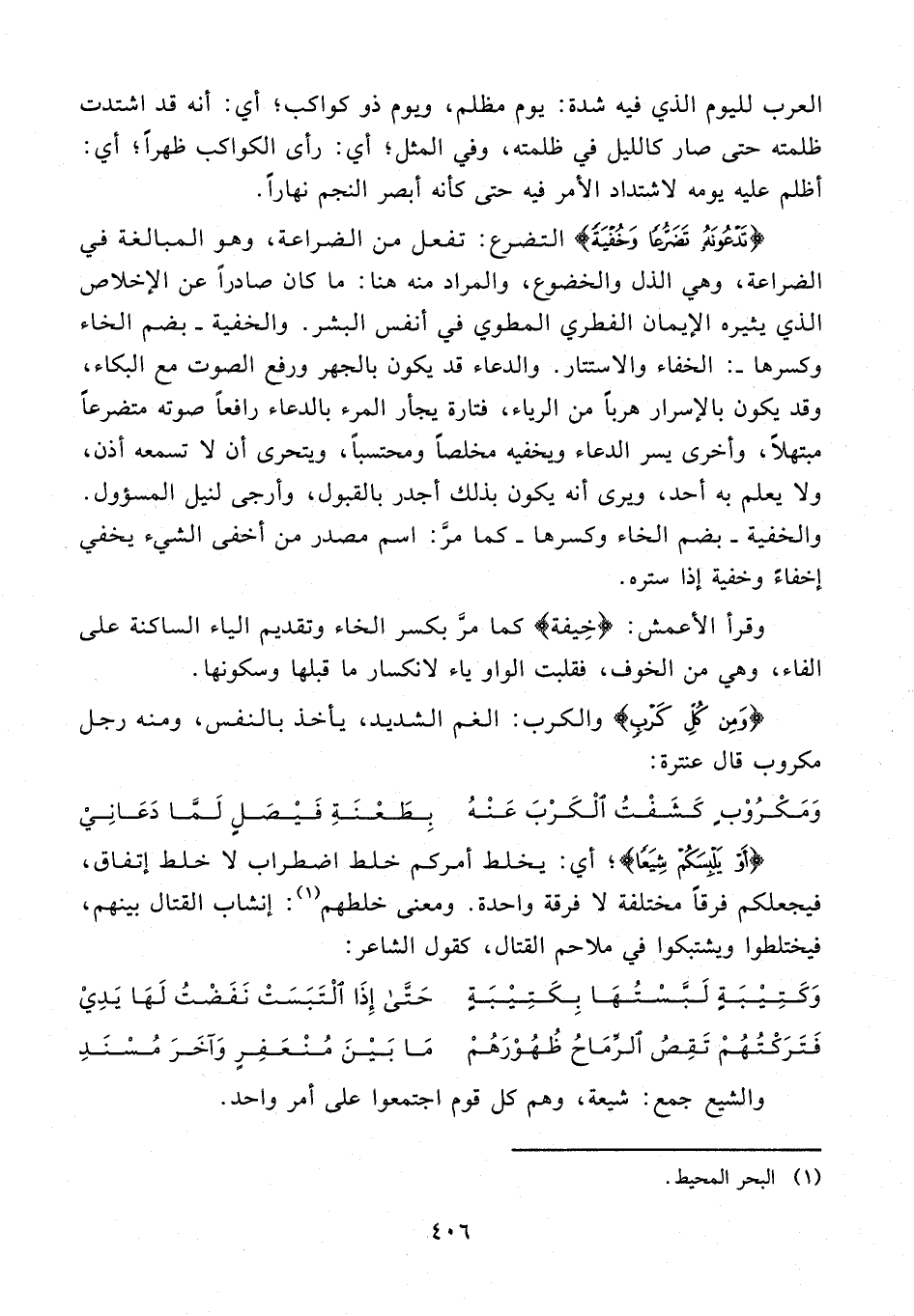 {تَدْعُونَهُ تَضَرُّعًا وَخُفْيَةً} التضرع: تفعل من الضراعة، وهو المبالغة في الضراعة، وهي الذل والخضوع، والمراد منه هنا: ما كان صادرًا عن الإخلاص الذي يثيره الإيمان الفطري المطوي في أنفس البشر. والخفية - بضم الخاء وكسرها -: الخفاء والاستتار. والدعاء قد يكون بالجهر ورفع الصوت مع البكاء، وقد يكون بالإسرار هربًا من الرياء، فتارة يجأر المرء بالدعاء رافعًا صوته متضرعًا مبتهلًا، وأخرى يسر الدعاء ويخفيه مخلصًا ومحتسبًا، ويتحرى أن لا تسمعه أذن، ولا يعلم به أحد، ويرى أنه يكون بذلك أجدر بالقبول، وأرجى لنيل المسؤول. والخفية - بضم الخاء وكسرها - كما مرَّ: اسم مصدر من أخفى الشيء يخفي إخفاء وخفية إذا ستره.