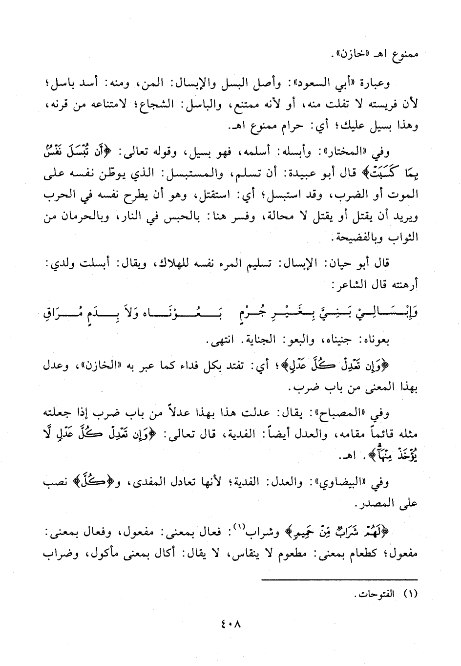 وعبارة "أبي السعود": وأصل البسل والإبسال: المن, ومنه: أسد باسل؛ لأن فريسته لا تفلت منه، أو لأنه ممتنع، والباسل: الشجاع؛ لامتناعه من قرنه، وهذا بسيل عليك؛ أي: حرام ممنوع اهـ.