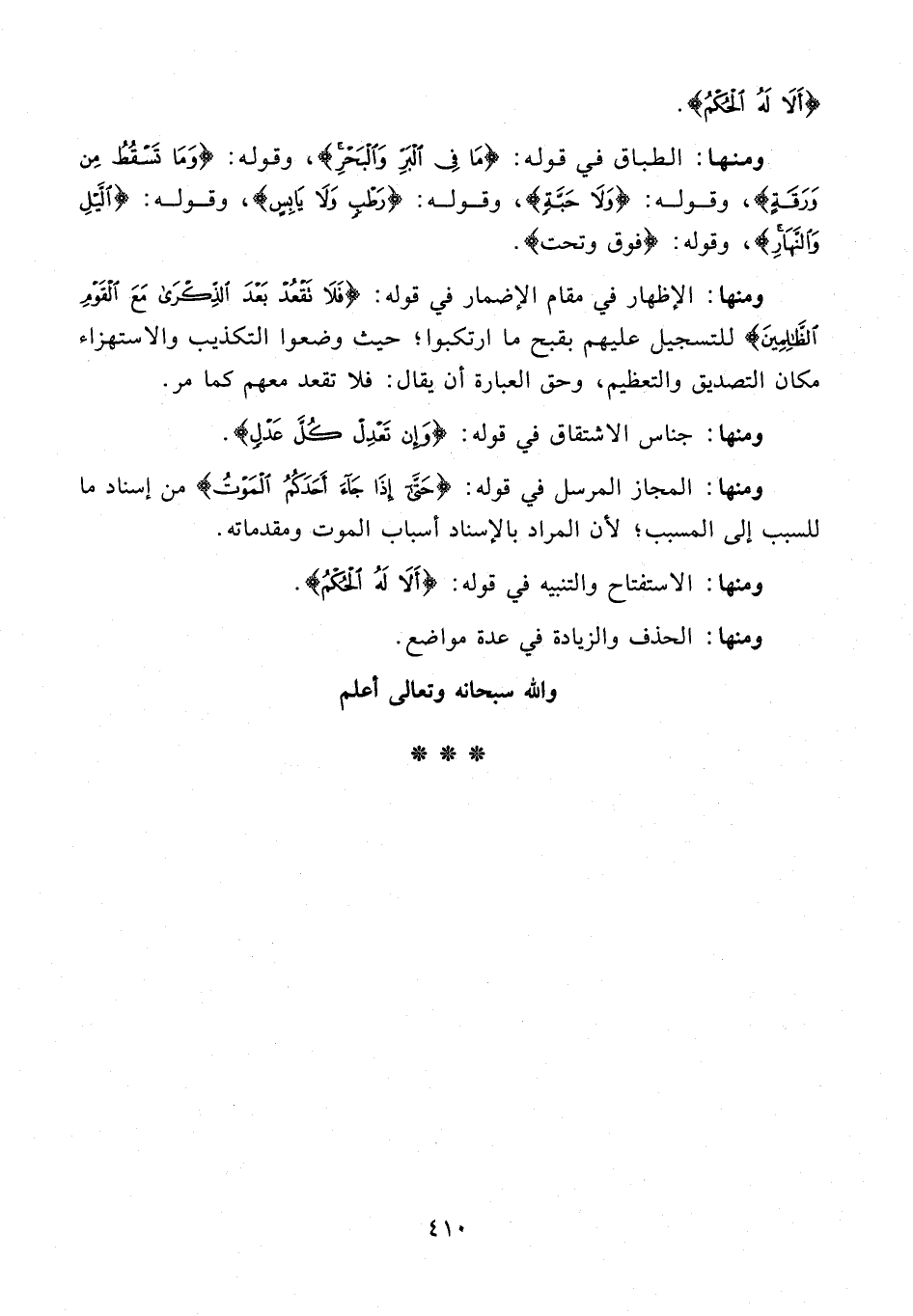 ومنها: الطباق في قوله: {مَا فِي الْبَرِّ وَالْبَحْرِ}، وقوله: {وَمَا تَسْقُطُ مِنْ وَرَقَةٍ}، وقوله: {وَلَا حَبَّةٍ}، وقوله: {رَطْبٍ وَلَا يَابِسٍ}، وقوله: {اللَّيْلِ وَالنَّهَارِ}، وقوله: {فوق وتحت}.