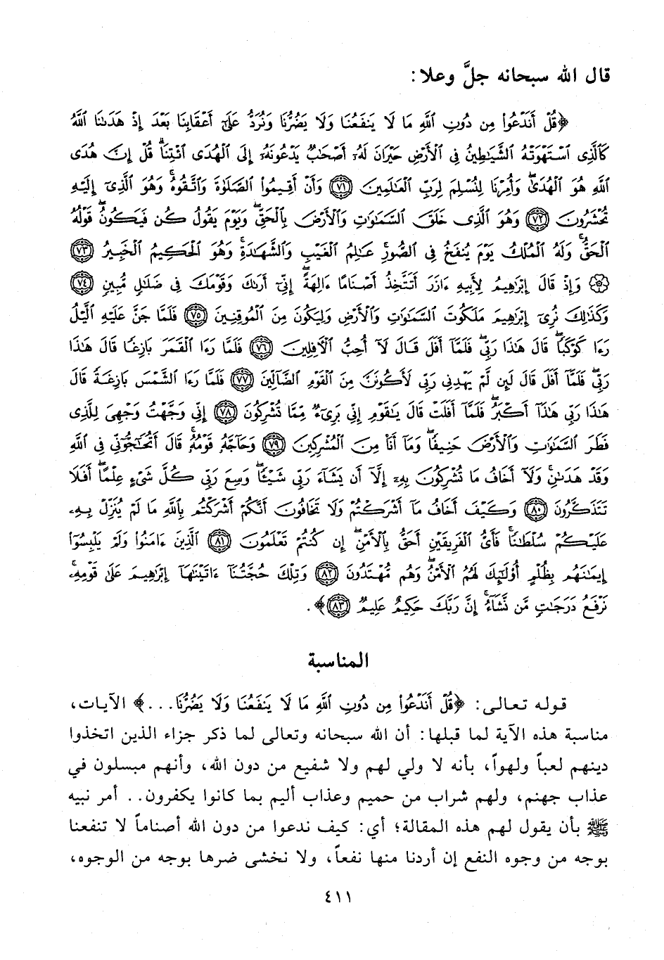 {قُلْ أَنَدْعُو مِنْ دُونِ اللَّهِ مَا لَا يَنْفَعُنَا وَلَا يَضُرُّنَا وَنُرَدُّ عَلَى أَعْقَابِنَا بَعْدَ إِذْ هَدَانَا اللَّهُ كَالَّذِي اسْتَهْوَتْهُ الشَّيَاطِينُ فِي الْأَرْضِ حَيْرَانَ لَهُ أَصْحَابٌ يَدْعُونَهُ إِلَى الْهُدَى ائْتِنَا قُلْ إِنَّ هُدَى اللَّهِ هُوَ الْهُدَى وَأُمِرْنَا لِنُسْلِمَ لِرَبِّ الْعَالَمِينَ (71) وَأَنْ أَقِيمُوا الصَّلَاةَ وَاتَّقُوهُ وَهُوَ الَّذِي إِلَيْهِ تُحْشَرُونَ (72) وَهُوَ الَّذِي خَلَقَ السَّمَاوَاتِ وَالْأَرْضَ بِالْحَقِّ وَيَوْمَ يَقُولُ كُنْ فَيَكُونُ قَوْلُهُ الْحَقُّ وَلَهُ الْمُلْكُ يَوْمَ يُنْفَخُ فِي الصُّورِ عَالِمُ الْغَيْبِ وَالشَّهَادَةِ وَهُوَ الْحَكِيمُ الْخَبِيرُ (73) وَإِذْ قَالَ إِبْرَاهِيمُ لِأَبِيهِ آزَرَ أَتَتَّخِذُ أَصْنَامًا آلِهَةً إِنِّي أَرَاكَ وَقَوْمَكَ فِي ضَلَالٍ مُبِينٍ (74) وَكَذَلِكَ نُرِي إِبْرَاهِيمَ مَلَكُوتَ السَّمَاوَاتِ وَالْأَرْضِ وَلِيَكُونَ مِنَ الْمُوقِنِينَ (75) فَلَمَّا جَنَّ عَلَيْهِ اللَّيْلُ رَأَى كَوْكَبًا قَالَ هَذَا رَبِّي فَلَمَّا أَفَلَ قَالَ لَا أُحِبُّ الْآفِلِينَ (76) فَلَمَّا رَأَى الْقَمَرَ بَازِغًا قَالَ هَذَا رَبِّي فَلَمَّا أَفَلَ قَالَ لَئِنْ لَمْ يَهْدِنِي رَبِّي لَأَكُونَنَّ مِنَ الْقَوْمِ الضَّالِّينَ (77) فَلَمَّا رَأَى الشَّمْسَ بَازِغَةً قَالَ هَذَا رَبِّي هَذَا أَكْبَرُ فَلَمَّا أَفَلَتْ قَالَ يَا قَوْمِ إِنِّي بَرِيءٌ مِمَّا تُشْرِكُونَ (78) إِنِّي وَجَّهْتُ وَجْهِيَ لِلَّذِي فَطَرَ السَّمَاوَاتِ وَالْأَرْضَ حَنِيفًا وَمَا أَنَا مِنَ الْمُشْرِكِينَ (79) وَحَاجَّهُ قَوْمُهُ قَالَ أَتُحَاجُّونِّي فِي اللَّهِ وَقَدْ هَدَانِ وَلَا أَخَافُ مَا تُشْرِكُونَ بِهِ إِلَّا أَنْ يَشَاءَ رَبِّي شَيْئًا وَسِعَ رَبِّي كُلَّ شَيْءٍ عِلْمًا أَفَلَا تَتَذَكَّرُونَ (80) وَكَيْفَ أَخَافُ مَا أَشْرَكْتُمْ وَلَا تَخَافُونَ أَنَّكُمْ أَشْرَكْتُمْ بِاللَّهِ مَا لَمْ يُنَزِّلْ بِهِ عَلَيْكُمْ سُلْطَانًا فَأَيُّ الْفَرِيقَيْنِ أَحَقُّ بِالْأَمْنِ إِنْ كُنْتُمْ تَعْلَمُونَ (81) الَّذِينَ آمَنُوا وَلَمْ يَلْبِسُوا إِيمَانَهُمْ بِظُلْمٍ أُولَئِكَ لَهُمُ الْأَمْنُ وَهُمْ مُهْتَدُونَ (82) وَتِلْكَ حُجَّتُنَا آتَيْنَاهَا إِبْرَاهِيمَ عَلَى قَوْمِهِ نَرْفَعُ دَرَجَاتٍ مَنْ نَشَاءُ إِنَّ رَبَّكَ حَكِيمٌ عَلِيمٌ (83)}.