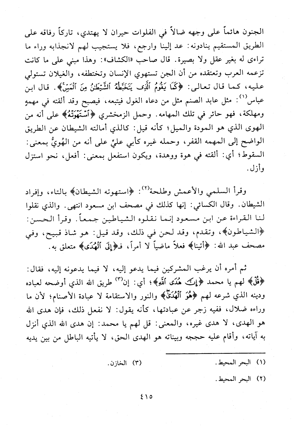 الجنون هائمًا على وجهه ضالًا في الفلوات حيران لا يهتدي، تاركًا رفاقه على الطريق المستقيم ينادونه: عد إلينا وارجع، فلا يستجيب لهم لانجذابه وراء ما تراءى له بغير عقل ولا بصيرة. قال صاحب "الكشاف": وهذا مبني على ما كانت تزعمه العرب وتعتقده من أن الجن تستهوي الإنسان وتختطفه، والغيلان تستولي عليه، كما قال تعالى: {كَمَا يَقُومُ الَّذِي يَتَخَبَّطُهُ الشَّيْطَانُ مِنَ الْمَسِّ}. قال ابن عباس (¬1): مثل عابد الصنم مثل من دعاه الغول فيتبعه، فيصبح وقد ألقته في مهمهٍ ومهلكة، فهو حائر في تلك المهامه. وحمل الزمخشري {اسْتَهْوَتْهُ} على أنه من الهوى الذي هو المودة والميل؛ كأنه قيل: كالذي أمالته الشيطان عن الطريق الواضح إلى المهمه القفر، وحمله غيره كأبي عليّ على أنه من الهُويُّ بمعنى: السقوط؛ أي: ألقته في هوة ووهدة، ويكون استفعل بمعنى: أفعل، نحو استزل وأزل.