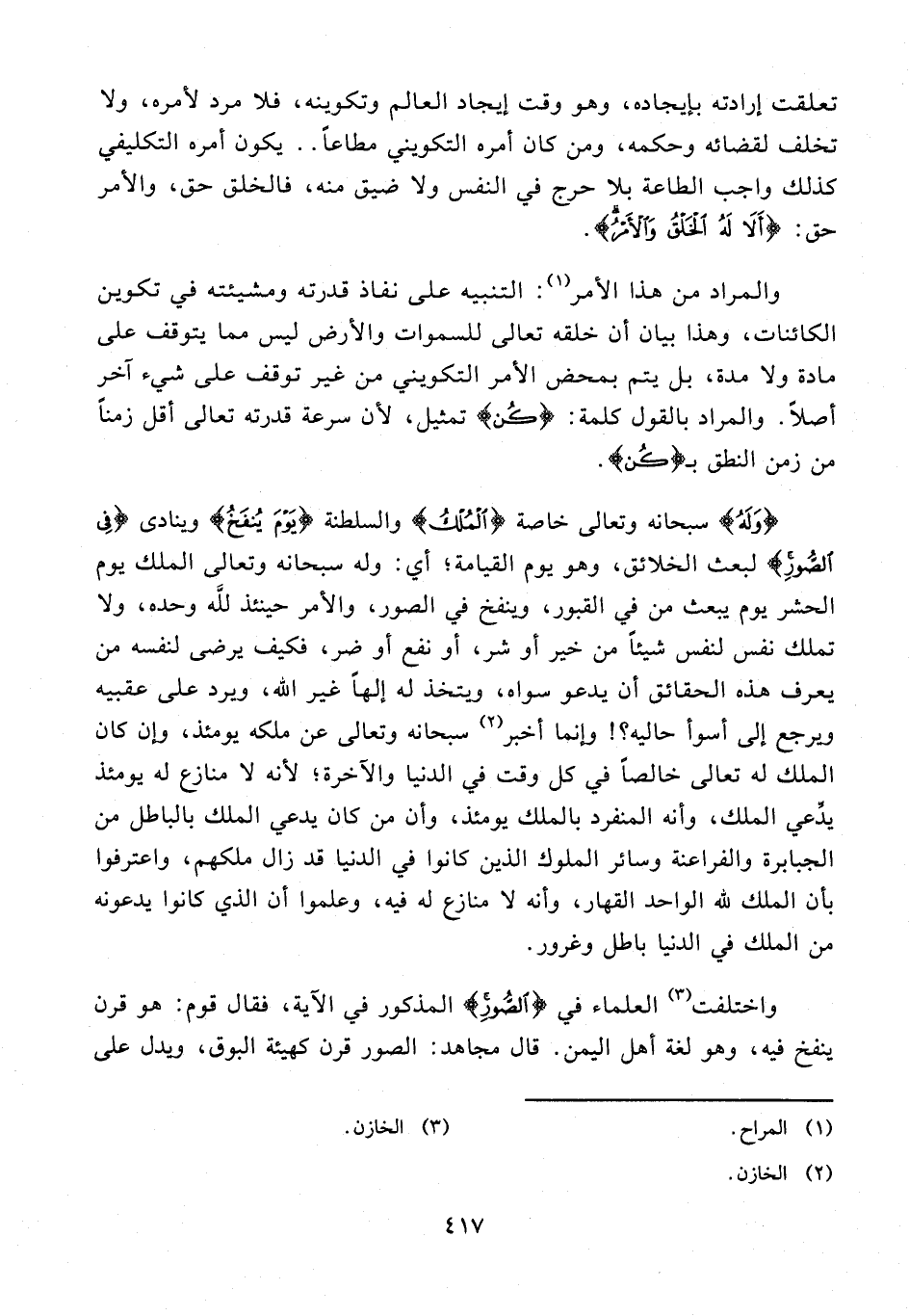 {وَلَهُ} سبحانه وتعالى خاصة {الْمُلْكُ} والسلطنة {يَوْمَ يُنْفَخُ} وينادى {فِي الصُّورِ} لبعث الخلائق، وهو يوم القيامة؛ أي: وله سبحانه وتعالى الملك يوم الحشر يوم يبعث من في القبور، وينفخ في الصور، والأمر حينئذ لله وحده، ولا تملك نفس لنفس شيئًا من خير أو شر، أو نفع أو ضر، فكيف يرضى لنفسه من يعرف هذه الحقائق أن يدعو سواه، ويتخذ له إلهًا غير الله، ويرد على عقبيه ويرجع إلى أسوأ حاليه؟! وإنما أخبر (¬2) سبحانه وتعالى عن ملكه يومئذ، وإن كان الملك له تعالى خالصًا في كل وقت في الدنيا والآخرة؛ لأنه لا منازع له يومئذ يدِّعي الملك، وأنه المنفرد بالملك يومئذ، وأن من كان يدعي الملك بالباطل من الجبابرة والفراعنة وسائر الملوك الذين كانوا في الدنيا قد زال ملكهم، واعترفوا بأن الملك لله الواحد القهار، وأنه لا منازع له فيه، وعلموا أن الذي كانوا يدعونه من الملك في الدنيا باطل وغرور.