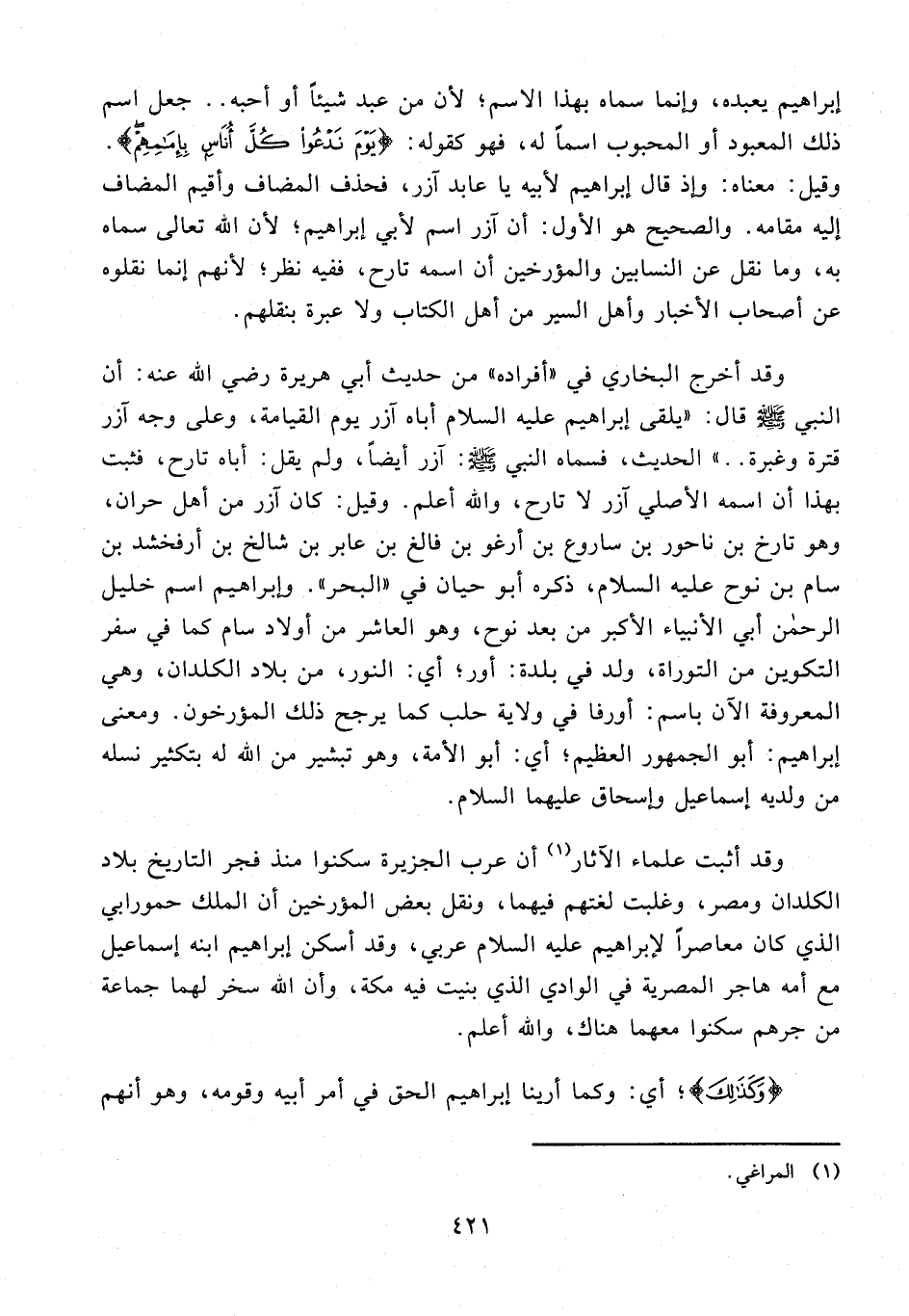 وقد أخرج البخاري في "أفراده" من حديث أبي هريرة رضي الله عنه: أن النبي - صلى الله عليه وسلم - قال: "يلقى إبراهيم عليه السلام أباه آزر يوم القيامة، وعلى وجه آزر قترة وغبرة .. " الحديث، فسماه النبي - صلى الله عليه وسلم -: آزر أيضًا، ولم يقل: أباه تارح، فثبت بهذا أن اسمه الأصلي آزر لا تارح، والله أعلم. وقيل: كان آزر من أهل حران، وهو تارخ بن ناحور بن ساروع بن أرغو بن فالغ بن عابر بن شالخ بن أرفخشد بن سام بن نوح عليه السلام، ذكره أبو حيان في "البحر". وإبراهيم اسم خليل الرحمن أبي الأنبياء الأكبر من بعد نوح، وهو العاشر من أولاد سام كما في سفر التكوين من التوراة، ولد في بلدة: أور؛ أي: النور، من بلاد الكلدان، وهي المعروفة الآن باسم: أورفا في ولاية حلب كما يرجح ذلك المؤرخون. ومعنى إبراهيم: أبو الجمهور العظيم؛ أي: أبو الأمة، وهو تبشير من الله له بتكثير نسله من ولديه إسماعيل وإسحاق عليهما السلام.
