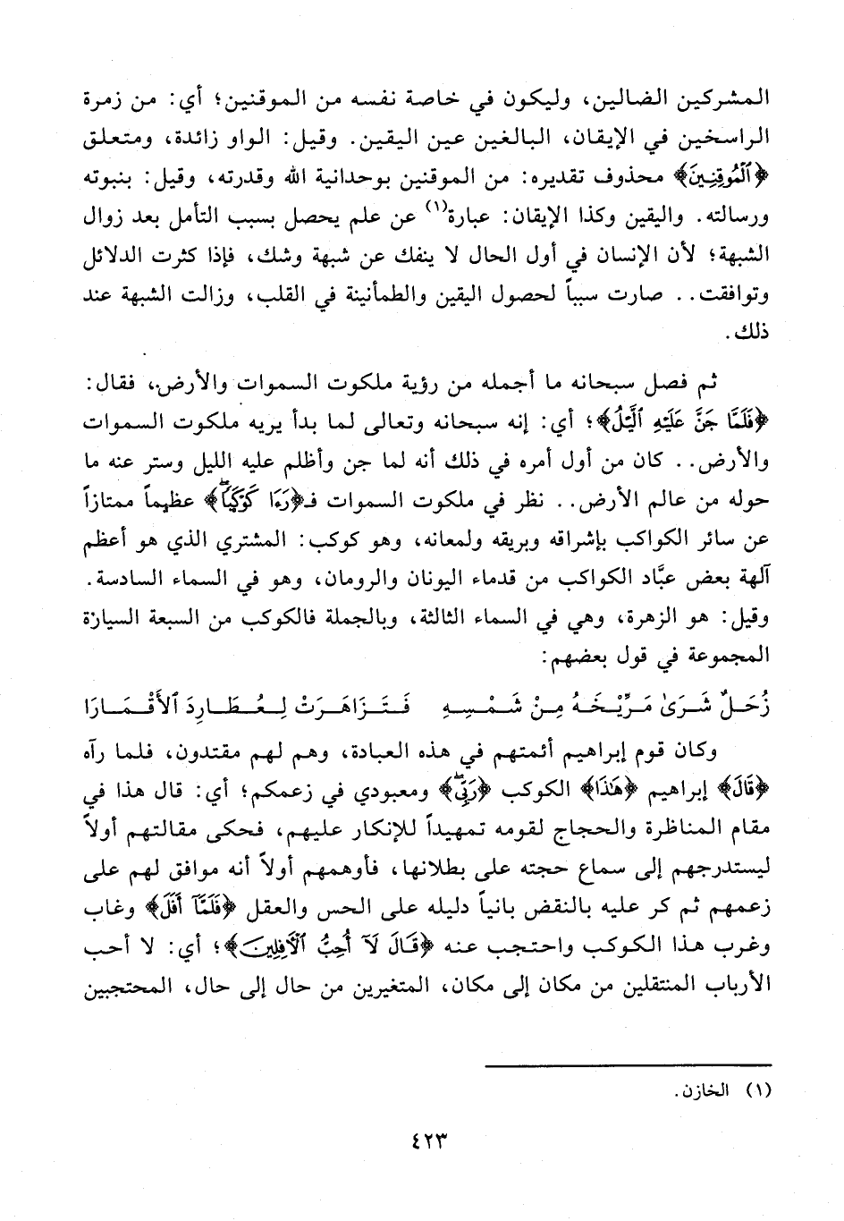 وكان قوم إبراهيم أئمتهم في هذه العبادة، وهم لهم مقتدون، فلما رآه {قَالَ} إبراهيم {هَذَا} الكوكب {رَبِّي} ومعبودي في زعمكم؛ أي: قال هذا في مقام المناظرة والحجاج لقومه تمهيدًا للإنكار عليهم، فحكى مقالتهم أولًا ليستدرجهم إلى سماع حجته على بطلانها، فأوهمهم أولًا أنه موافق لهم على زعمهم ثم كر عليه بالنقض بانيًا دليله على الحس والعقل {فَلَمَّا أَفَلَ} وغاب وغرب هذا الكوكب واحتجب عنه {قَالَ لَا أُحِبُّ الْآفِلِينَ}؛ أي: لا أحب الأرباب المنتقلين من مكان إلى مكان، المتغيرين من حال إلى حال، المحتجبين