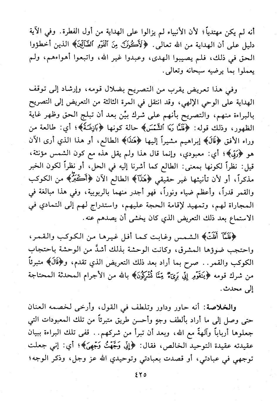 والخلاصة: أنه حاور وداور وتلطف في القول، وأرخى لخصمه العنان حتى وصل إلى ما أراد بألطف وجهٍ وأحسن طريق متبرئًا من تلك المعبودات التي جعلوها أربابًا وآلهةً مع الله،
