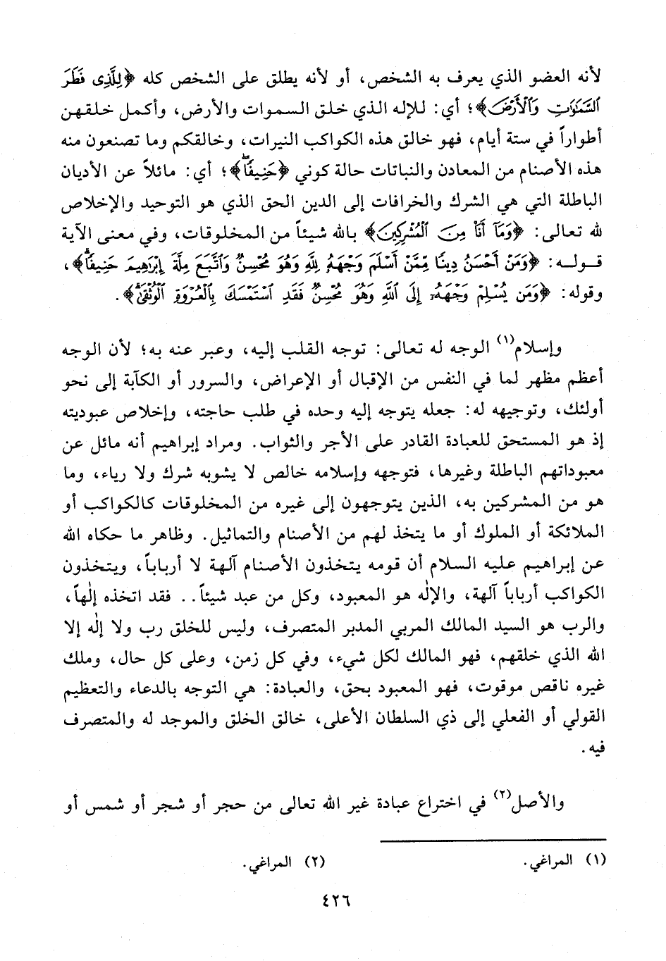 وإسلام (¬1) الوجه له تعالى: توجه القلب إليه، وعبر عنه به؛ لأن الوجه أعظم مظهر لما في النفس من الإقبال أو الإعراض، والسرور أو الكآبة إلى نحو أولئك، وتوجيهه له: جعله يتوجه إليه وحده في طلب حاجته، وإخلاص عبوديته إذ هو المستحق للعبادة القادر على الأجر والثواب. ومراد إبراهيم أنه مائل عن معبوداتهم الباطلة وغيرها، فتوجهه وإسلامه خالص لا يشوبه شرك ولا رياء، وما هو من المشركين به، الذين يتوجهون إلى غيره من المخلوقات كالكواكب أو الملائكة أو الملوك أو ما يتخذ لهم من الأصنام والتماثيل. وظاهر ما حكاه الله عن إبراهيم عليه السلام أن قومه يتخذون الأصنام آلهة لا أربابًا، ويتخذون الكواكب أربابًا آلهة، والإله هو المعبود، وكل من عبد شيئًا .. فقد اتخذه إلهًا، والرب هو السيد المالك المربي المدبر المتصرف، وليس للخلق رب ولا إله إلا الله الذي خلقهم، فهو المالك لكل شيء، وفي كل زمن، وعلى كل حال، وملك غيره ناقص موقوت، فهو المعبود بحق، والعبادة: هي التوجه بالدعاء والتعظيم القولي أو الفعلي إلى ذي السلطان الأعلى، خالق الخلق والموجد له والمتصرف فيه.