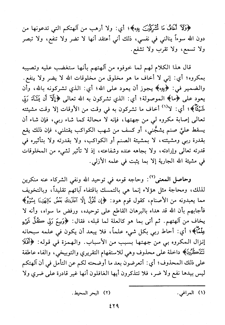 قال هذا الكلام لهم لما خوفوه من آلهتهم بأنها ستغضب عليه وتصيبه بمكروه؛ أي: إني لا أخاف ما هو مخلوق من مخلوقات الله لا يضر ولا ينفع. والضمير في: {بِهِ} يجوز أن يعود على الله؛ أي: الذي تشركونه بالله، وأن يعود على {مَا} الموصولة؛ أي: الذي تشركون به الله تعالى {إِلَّا أَنْ يَشَاءَ رَبِّي شَيْئًا}؛ أي: لا (¬1) أخاف ما تشركون به في وقت من الأوقات إلا وقت مشيئته تعالى إصابة مكروه لي من جهتها، فإنه لا محالة كما شاء ربي، فإن شاء أن يسقط عليَّ صنم يشجُّني، أو كسف من شهب الكواكب يقتلني، فإن ذلك يقع بقدرة ربي ومشيئته، لا بمشيئة الصنم أو الكواكب، ولا بقدرته ولا بتأثيره في قدرته تعالى وإرادته، ولا بجاهه عنده وشفاعته، إذ لا تأثير لشيء من المخلوقات في مشيئة الله الجارية إلا بما يثبت في علمه الأزلي.