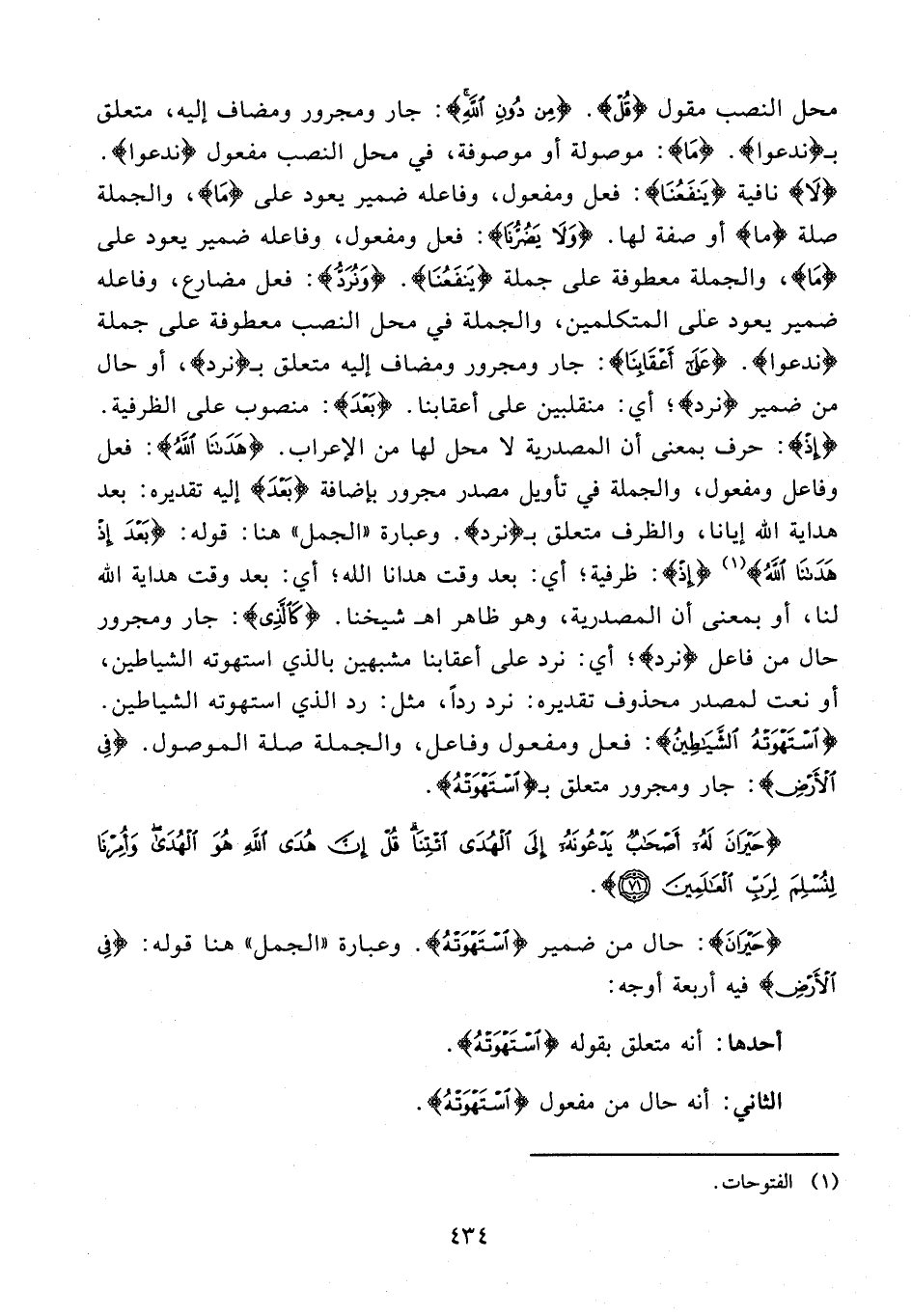 محل النصب مقول {قُلْ}. {مِنْ دُونِ اللهِ}: جار ومجرور ومضاف إليه، متعلق بـ {نَدْعُو}. {مَا}: موصولة أو موصوفة، في محل النصب مفعول {نَدْعُو}. {لَا} نافية {يَنْفَعُنَا}: فعل ومفعول، وفاعله ضمير يعود على {مَا}، والجملة صلة {ما} أو صفة لها. {وَلَا يَضُرُّنَا}: فعل ومفعول، وفاعله ضمير يعود على {مَا}، والجملة معطوفة على جملة {يَنْفَعُنَا}. {وَنُرَدُّ}: فعل مضارع، وفاعله ضمير يعود علي المتكلمين، والجملة في محل النصب معطوفة على جملة {نَدْعُو}. {عَلَى أَعْقَابِنَا}: جار ومجرور ومضاف إليه متعلق بـ {نُرَدُّ}، أو حال من ضمير {نُرَدُّ}؛ أي: منقلبين على أعقابنا. {بَعْدَ}: منصوب على الظرفية. {إِذْ}: حرف بمعنى أن المصدرية لا محل لها من الإعراب. {هَدَانَا الله}: فعل وفاعل ومفعول، والجملة في تأويل مصدر مجرور بإضافة {بَعْدَ} إليه تقديره: بعد هداية الله إيانا، والظرف متعلق بـ {نُرَدُّ}. وعبارة "الجمل" هنا: قوله: {بَعْدَ إِذْ هَدَانَا الله} (¬1) {إِذْ}: ظرفية؛ أي: بعد وقت هدانا الله؛ أي: بعد وقت هداية الله لنا، أو بمعنى أن المصدرية، وهو ظاهر اهـ شيخنا. {كَالَّذِي}: جار ومجرور حال من فاعل {نُرَدُّ}؛ أي: نرد على أعقابنا مشبهين بالذي استهوته الشياطين، أو نعت لمصدر محذوف تقديره: نرد ردًّا، مثل: رد الذي استهوته الشياطين. {اسْتَهْوَتْهُ الشَّيَاطِينُ}: فعل ومفعول وفاعل، والجملة صلة الموصول. {في الْأَرْضِ}: جار ومجرور متعلق بـ {اسْتَهْوَتْهُ}.