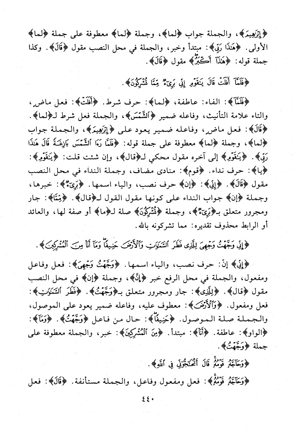{فَلَمَّا}: الفاء: عاطفة، {لَمَّا}: حرف شرط. {أَفَلَتْ}: فعل ماضٍ، والتاء علامة التأنيث، وفاعله ضمير {الشَّمْسَ}، والجملة فعل شرط لـ {لَمَّا}. {قَالَ}: فعل ماضٍ، وفاعله ضمير يعود على {إِبْرَاهِيمَ}، والجملة جواب {لَمَّا}، وجملة {لَمَّا} معطوفة على جملة قوله: {فَلَمَّا رَأَى الشَّمْسَ بَازِغَةً قَالَ هَذَا رَبِّي}. {يَا قَوْمِ} إلى آخره مقول محكي لـ {قَالَ}، وإن شئت قلت: {يَا قَوْمِ}: {يَا}: حرف نداء. {قَوْمِ}: منادى مضاف، وجملة النداء في محل النصب مقول {قَالَ}. {إِنِّي}: {إن} حرف نصب، والياء اسمها. {بَرِيءٌ}: خبرها، وجملة {إن} جواب النداء على كونها مقول القول لـ {قَالَ}. {مِمَّا}: جار ومجرور متعلق بـ {بَرِيءٌ}، وجملة {تُشْرِكُونَ} صلة لـ {ما} أو صفة لها، والعائد أو الرابط محذوف تقديره: مما تشركونه بالله.