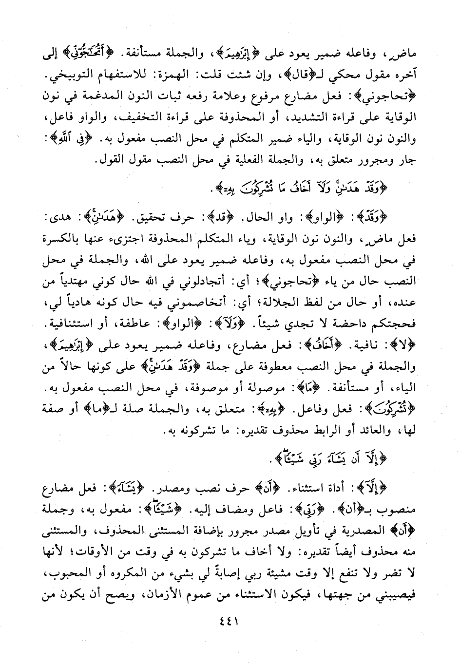 {وَقَدْ}: {الواو}: واو الحال. {قَدْ}: حرف تحقيق. {هَدَانِ}: هدى: فعل ماضٍ، والنون نون الوقاية، وياء المتكلم المحذوفة اجتزىء عنها بالكسرة في محل النصب مفعول به، وفاعله ضمير يعود على الله، والجملة في محل النصب حال من ياء {تُحَاجُّونِّي}؛ أي: أتجادلوني في الله حال كوني مهتديًا من عنده، أو حال من لفظ الجلالة؛ أي: أتخاصموني فيه حال كونه هاديًا لي، فحجتكم داحضة لا تجدي شيئًا. {وَلَا}: {الواو}: عاطفة، أو استئنافية. {لَا}: نافية. {أَخَافُ}: فعل مضارع، وفاعله ضمير يعود على {إِبْرَاهِيمَ}، والجملة في محل النصب معطوفة على جملة {وَقَدْ هَدَانِ} على كونها حالًا من الياء، أو مستأنفة. {مَا}: موصولة أو موصوفة، في محل النصب مفعول به. {تُشْرِكُونَ}: فعل وفاعل. {بِهِ}: متعلق به، والجملة صلة لـ {ما} أو صفة لها، والعائد أو الرابط محذوف تقديره: ما تشركونه به.