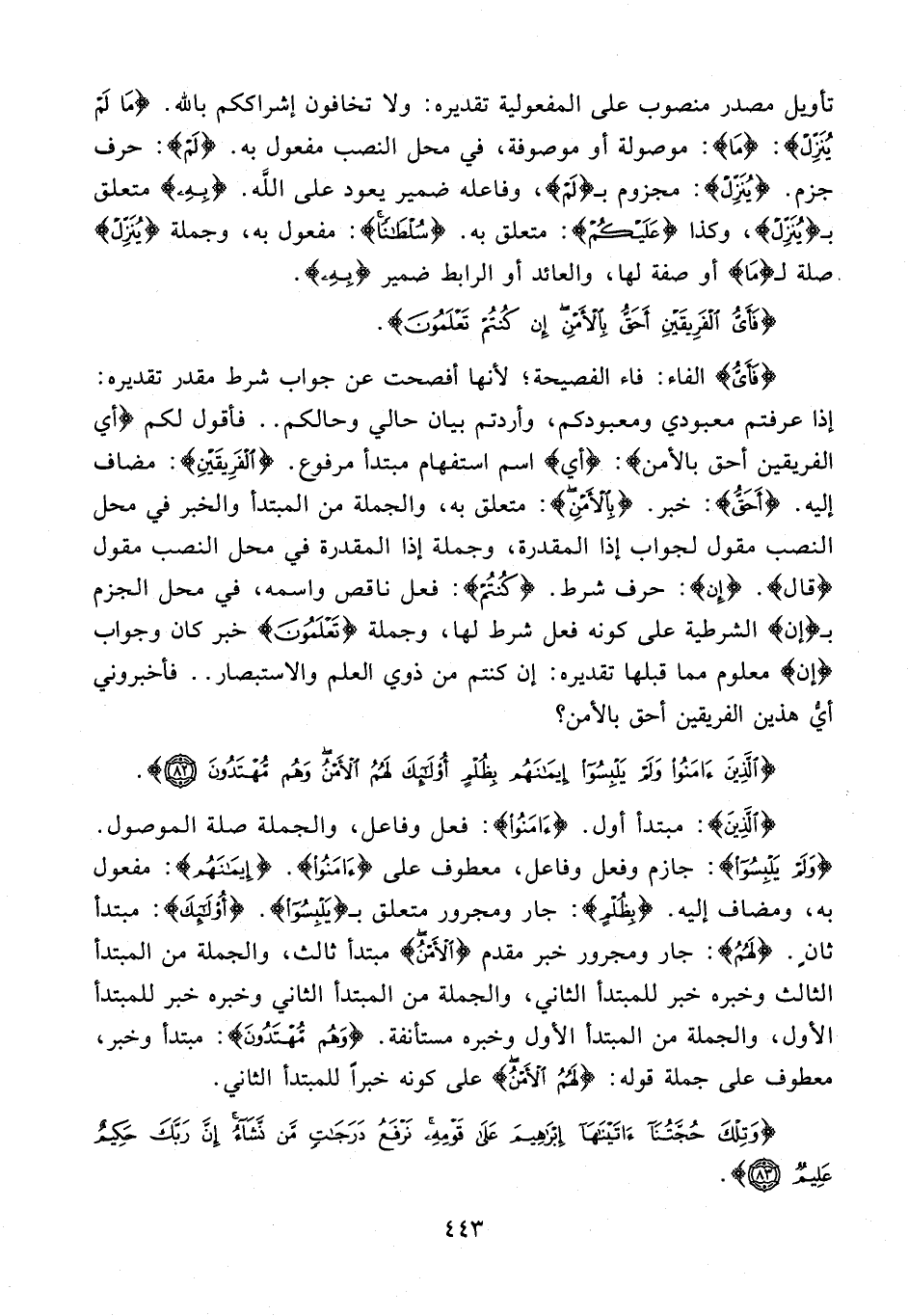 {فَأَيُّ} الفاء: فاء الفصيحة؛ لأنها أفصحت عن جواب شرط مقدر تقديره: إذا عرفتم معبودي ومعبودكم، وأردتم بيان حالي وحالكم .. فأقول لكم {أَيُّ الْفَرِيقَيْنِ أَحَقُّ بِالْأَمْنِ}: {أَيُّ} اسم استفهام مبتدأ مرفوع. {الْفَرِيقَيْنِ}: مضاف إليه. {أَحَقُّ}: خبر. {بِالْأَمْنِ}: متعلق به، والجملة من المبتدأ والخبر في محل النصب مقول لجواب إذا المقدرة، وجملة إذا المقدرة في محل النصب مقول {قَالَ}. {إِنْ}: حرف شرط. {كُنْتُمْ}: فعل ناقص واسمه، في محل الجزم بـ {إن} الشرطية على كونه فعل شرط لها، وجملة {تَعْلَمُونَ} خبر كان وجواب {إِنْ} معلوم مما قبلها تقديره: إن كنتم من ذوي العلم والاستبصار .. فأخبروني أيُّ هذين الفريقين أحق بالأمن؟