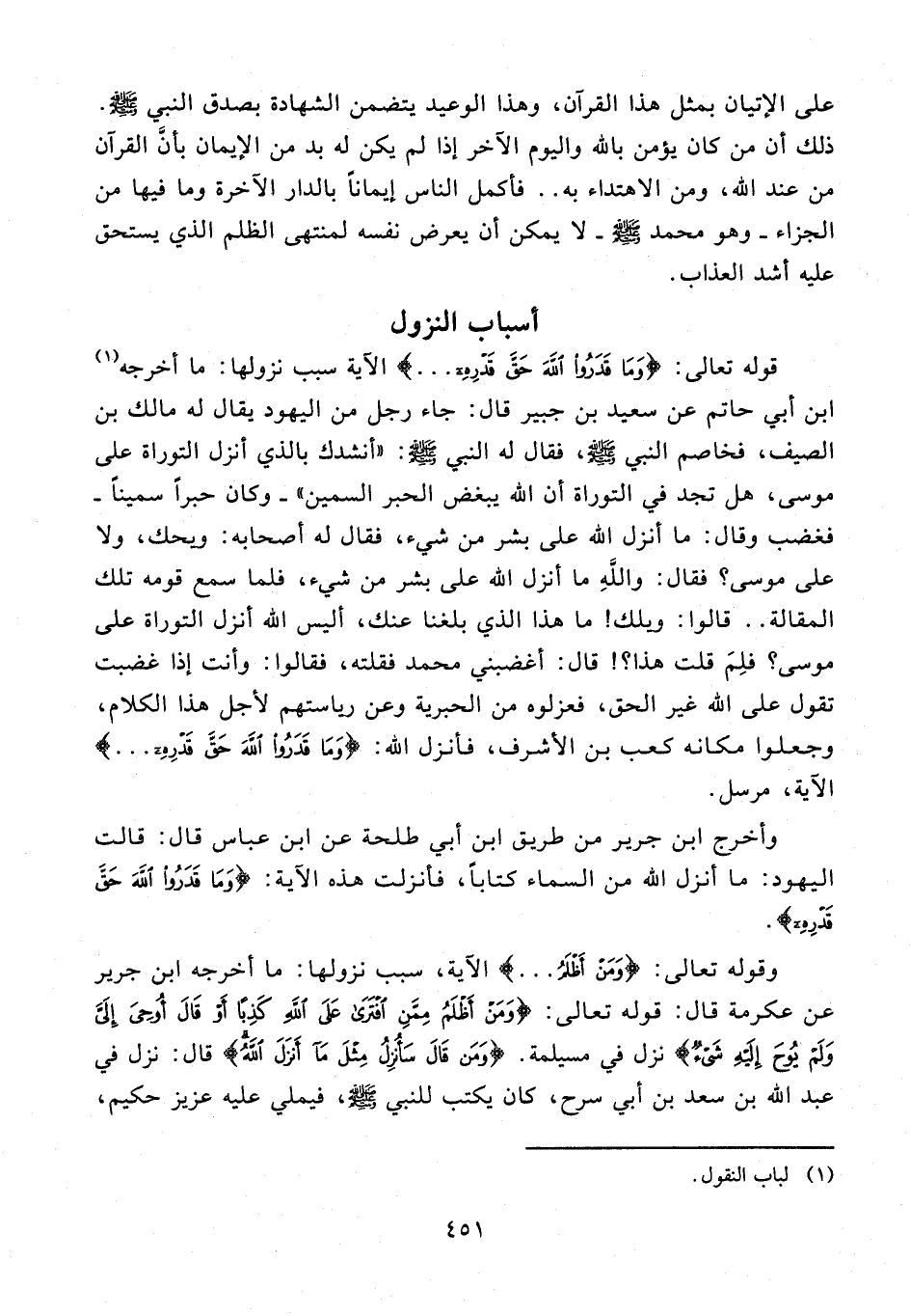 قوله تعالى: {وَمَا قَدَرُوا اللَّهَ حَقَّ قَدْرِهِ ...} الآية سبب نزولها: ما أخرجه (¬1) ابن أبي حاتم عن سعيد بن جبير قال: جاء رجل من اليهود يقال له مالك بن الصيف، فخاصم النبي - صلى الله عليه وسلم -، فقال له النبي - صلى الله عليه وسلم -: "أنشدك بالذي أنزل التوراة على موسى، هل تجد في التوراة أن الله يبغض الحبر السمين" - وكان حبرًا سمينًا - فغضب وقال: ما أنزل الله على بشر من شيء، فقال له أصحابه: ويحك، ولا على موسى؟ فقال: واللهِ ما أنزل الله على بشر من شيء، فلما سمع قومه تلك المقالة .. قالوا: ويلك! ما هذا الذي بلغنا عنك، أليس الله أنزل التوراة على موسى؟ فلِمَ قلت هذا؟! قال: أغضبني محمَّد فقلته، فقالوا: وأنت إذا غضبت تقول على الله غير الحق، فعزلوه من الحبرية وعن رياستهم لأجل هذا الكلام، وجعلوا مكانه كعب بن الأشرف، فأنزل الله: {وَمَا قَدَرُوا اللَّهَ حَقَّ قَدْرِهِ ...} الآية، مرسل.