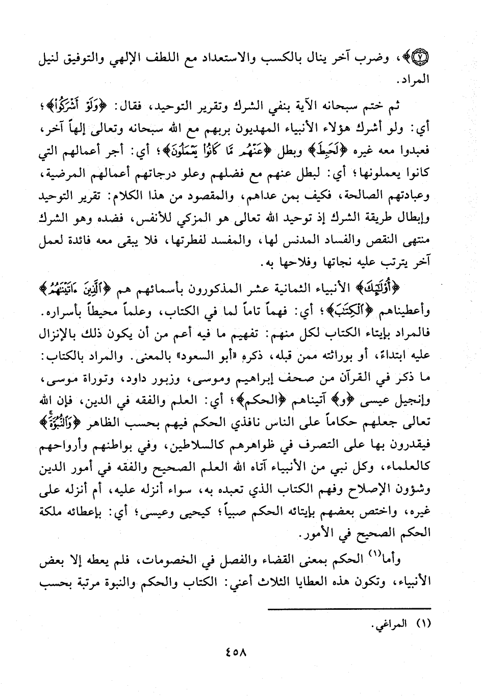 89 - {أُولَئِكَ} الأنبياء الثمانية عشر المذكورون بأسمائهم هم {الَّذِينَ آتَيْنَاهُمُ} وأعطيناهم {الْكِتَابَ}؛ أي: فهمًا تامًّا لما في الكتاب، وعلمًا محيطًا بأسراره. فالمراد بإيتاء الكتاب لكل منهم: تفهيم ما فيه أعم من أن يكون ذلك بالإنزال عليه ابتداءً، أو بوراثته ممن قبله، ذكره "أبو السعود" بالمعنى. والمراد بالكتاب: ما ذكر في القرآن من صحف إبراهيم وموسى، وزبور داود، وتوراة موسى، وإنجيل عيسى {و} آتيناهم {الْحُكْمَ}؛ أي: العلم والفقه في الدين، فإن الله تعالى جعلهم حكامًا على الناس نافذي الحكم فيهم بحسب الظاهر {وَالنُّبُوَّةَ} فيقدرون بها على التصرف في ظواهرهم كالسلاطين، وفي بواطنهم وأرواحهم كالعلماء، وكل نبي من الأنبياء آتاه الله العلم الصحيح والفقه في أمور الدين وشؤون الإصلاح وفهم الكتاب الذي تعبده به، سواء أنزله عليه، أم أنزله على غيره، واختص بعضهم بإتائه الحكم صبيًّا؛ كيحيى وعيسى؛ أي: بإعطائه ملكة الحكم الصحيح في الأمور.