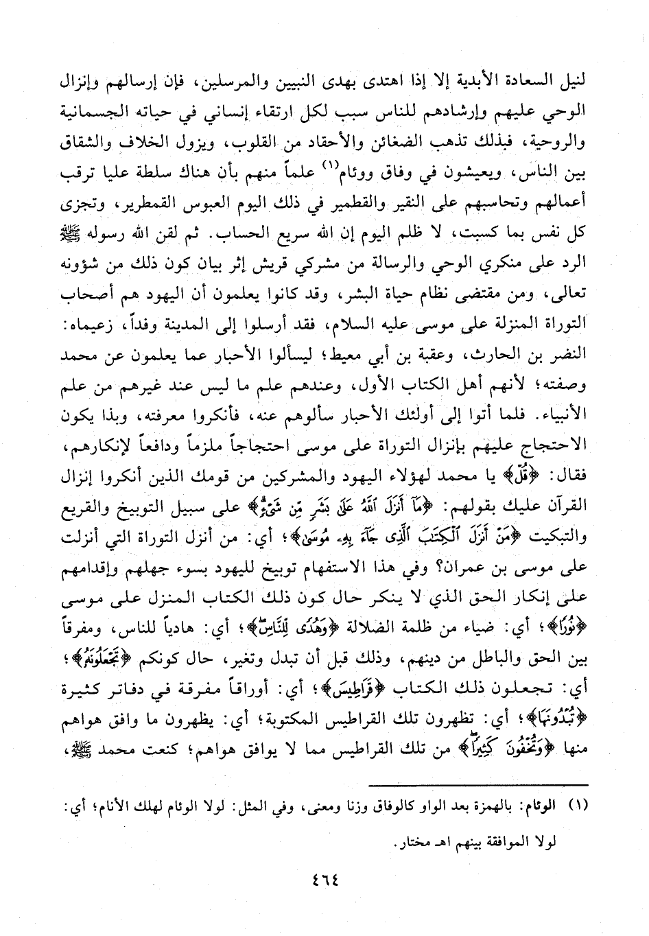 لنيل السعادة الأبدية إلا إذا اهتدى بهدى النبيين والمرسلين، فإن إرسالهم وإنزال الوحي عليهم وإرشادهم للناس سبب لكل ارتقاء إنساني في حياته الجسمانية والروحية، فبذلك تذهب الضغائن والأحقاد من القلوب، ويزول الخلاف والشقاق بين الناس، ويعيشون في وفاق ووئام (¬1) علمًا منهم بأن هناك سلطة عليا ترقب أعمالهم وتحاسبهم على النقير والقطمير في ذلك اليوم العبوس القمطرير، وتجزى كل نفس بما كسبت، لا ظلم اليوم إن الله سريع الحساب. ثم لقن الله رسوله - صلى الله عليه وسلم - الرد على منكري الوحي والرسالة من مشركي قريش إثر بيان كون ذلك من شؤونه تعالى، ومن مقتضى نظام حياة البشر، وقد كانوا يعلمون أن اليهود هم أصحاب التوراة المنزلة على موسى عليه السلام، فقد أرسلوا إلى المدينة وفدًا، زعيماه: النضر بن الحارث، وعقبة بن أبي معيط؛ ليسألوا الأحبار عما يعلمون عن محمَّد وصفته؛ لأنهم أهل الكتاب الأول، وعندهم علم ما ليس عند غيرهم من علم الأنبياء. فلما أتوا إلى أولئك الأحبار سألوهم عنه، فأنكروا معرفته، وبذا يكون الاحتجاج عليهم بإنزال التوراة على موسى احتجاجًا ملزمًا ودافعًا لإنكارهم، فقال: {قُلْ} يا محمَّد لهؤلاء اليهود والمشركين من قومك الذين أنكروا إنزال القرآن عليك بقولهم: {مَا أَنْزَلَ اللَّهُ عَلَى بَشَرٍ مِنْ شَيْءٍ} على سبيل التوبيخ والقريع والتبكيت {مَنْ أَنْزَلَ الْكِتَابَ الَّذِي جَاءَ بِهِ مُوسَى}، أي: من أنزل التوراة التي أنزلت على موسى بن عمران؟ وفي هذا الاستفهام توبيخ لليهود بسوء جهلهم وإقدامهم على إنكار الحق الذي لا ينكر حال كون ذلك الكتاب المنزل على موسى {نُورًا} أي: ضياء من ظلمة الضلالة {وَهُدًى لِلنَّاسِ}؛ أي: هاديًا للناس، ومفرقًا بين الحق والباطل من دينهم، وذلك قبل أن تبدل وتغير، حال كونكم {تَجْعَلُونَهُ}؛ أي: تجعلون ذلك الكتاب {قَرَاطِيسَ}؛ أي: أوراقًا مفرقة في دفاتر كثيرة {تُبْدُونَهَا}؛ أي: تظهرون تلك القراطيس المكتوبة؛ أي: يظهرون ما وافق هواهم منها {وَتُخْفُونَ كَثِيرًا} من تلك القراطيس مما لا يوافق هواهم؛ كنعت محمَّد - صلى الله عليه وسلم -،