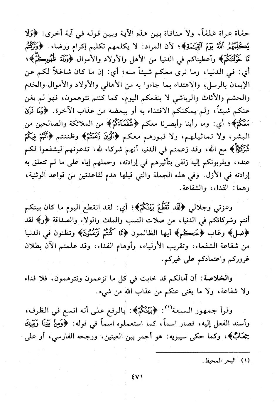 وقرأ جمهور السبعة (¬1): {بَيْنَكُمْ}: بالرفع على أنه اتسع في الظرف، وأسند الفعل إليه، فصار اسمًا، كما استعملوه اسمًا في قوله: {وَمِنْ بَيْنِنَا وَبَيْنِكَ حِجَابٌ}، وكما حكى سيبويه: هو أحمر بين العينين، ورجحه الفارسي، أو على