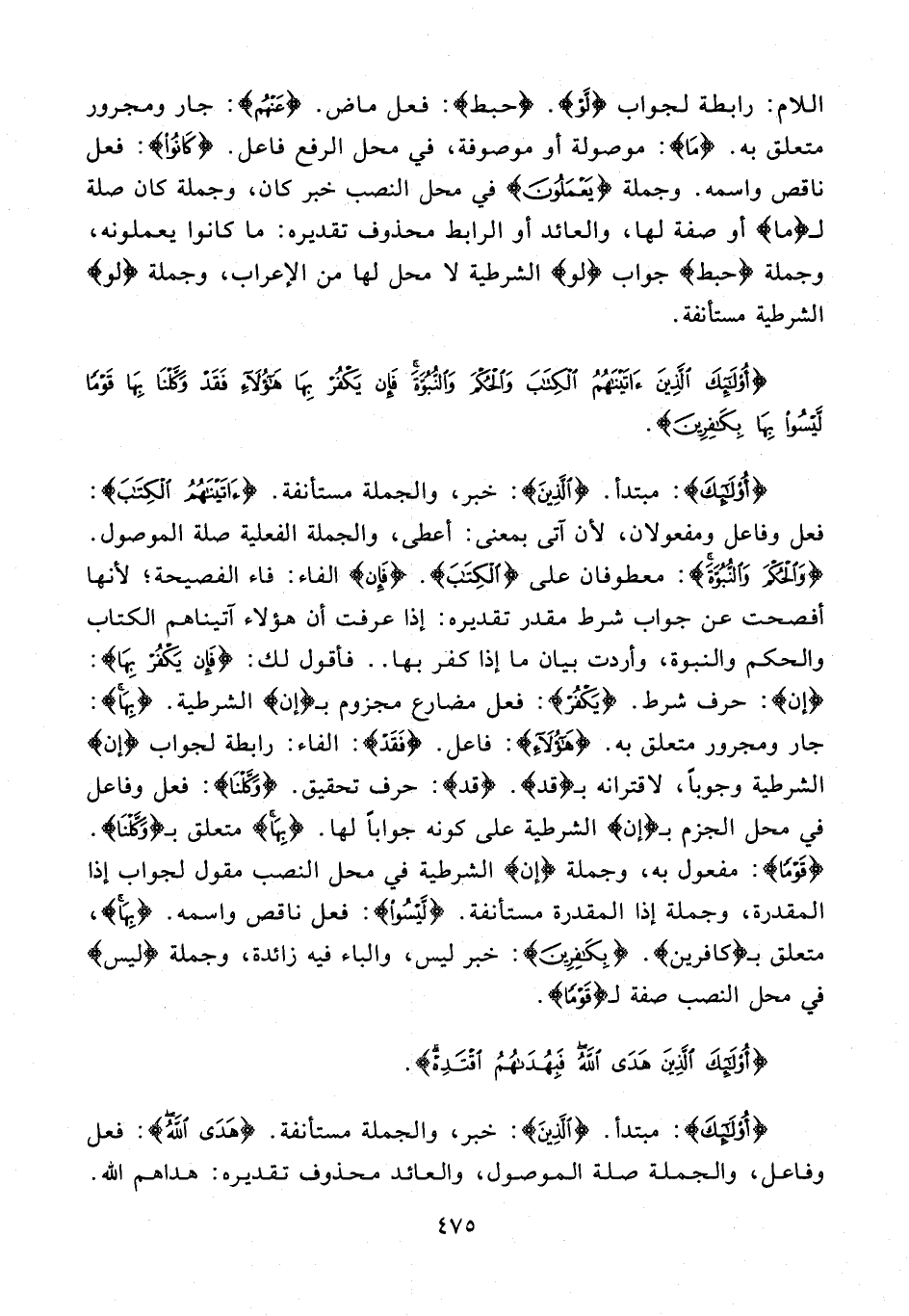 {أُولَئِكَ}: مبتدأ. {الَّذِينَ}: خبر، والجملة مستأنفة. {آتَيْنَاهُمُ الْكِتَابَ}: فعل وفاعل ومفعولان؛ لأن آتى بمعنى: أعطى، والجملة الفعلية صلة الموصول. {وَالْحُكْمَ وَالنُّبُوَّةَ}: معطوفان على {الْكِتَابَ}. {فَإِنْ} الفاء: فاء الفصيحة؛ لأنها أفصحت عن جواب شرط مقدر تقديره: إذا عرفت أن هؤلاء آتيناهم الكتاب والحكم والنبوة، وأردت بيان ما إذا كفر بها .. فأقول لك: {فَإِنْ يَكْفُرْ بِهَا}: {إن}: حرف شرط. {يَكْفُرْ}: فعل مضارع مجزوم بـ {إن} الشرطية. {بِهَا}: جار ومجرور متعلق به. {هَؤُلَاءِ}: فاعل. {فَقَدْ}: الفاء: رابطة لجواب {إن} الشرطية وجوبًا، لاقترانه بـ {قَدْ}. {قَدْ}: حرف تحقيق. {وَكَّلْنَا}: فعل وفاعل في محل الجزم بـ {إن} الشرطية على كونه جوابًا لها. {بِهَا} متعلق بـ {وَكَّلْنَا}. {قَوْمًا}: مفعول به، وجملة {إن} الشرطية في محل النصب مقول لجواب إذا المقدرة، وجملة إذا المقدرة مستأنفة. {لَيْسُوا}: فعل ناقص واسمه. {بِهَا}، متعلق بـ {كَافِرِينَ}. {بِكَافِرِينَ}: خبر ليس، والباء فيه زائدة، وجملة {ليس} في محل النصب صفة لـ {قَوْمًا}.