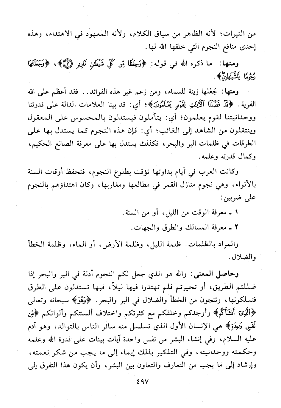 وحاصل المعنى: والله هو الذي جعل لكم النجوم أدلة في البر والبحر إذا ضللتم الطريق، أو تحيرتم فلم تهتدوا فيها ليلًا، فيها تستدلون على الطرق فتسلكونها، وتنجون من الخطأ والضلال في البر والبحر.