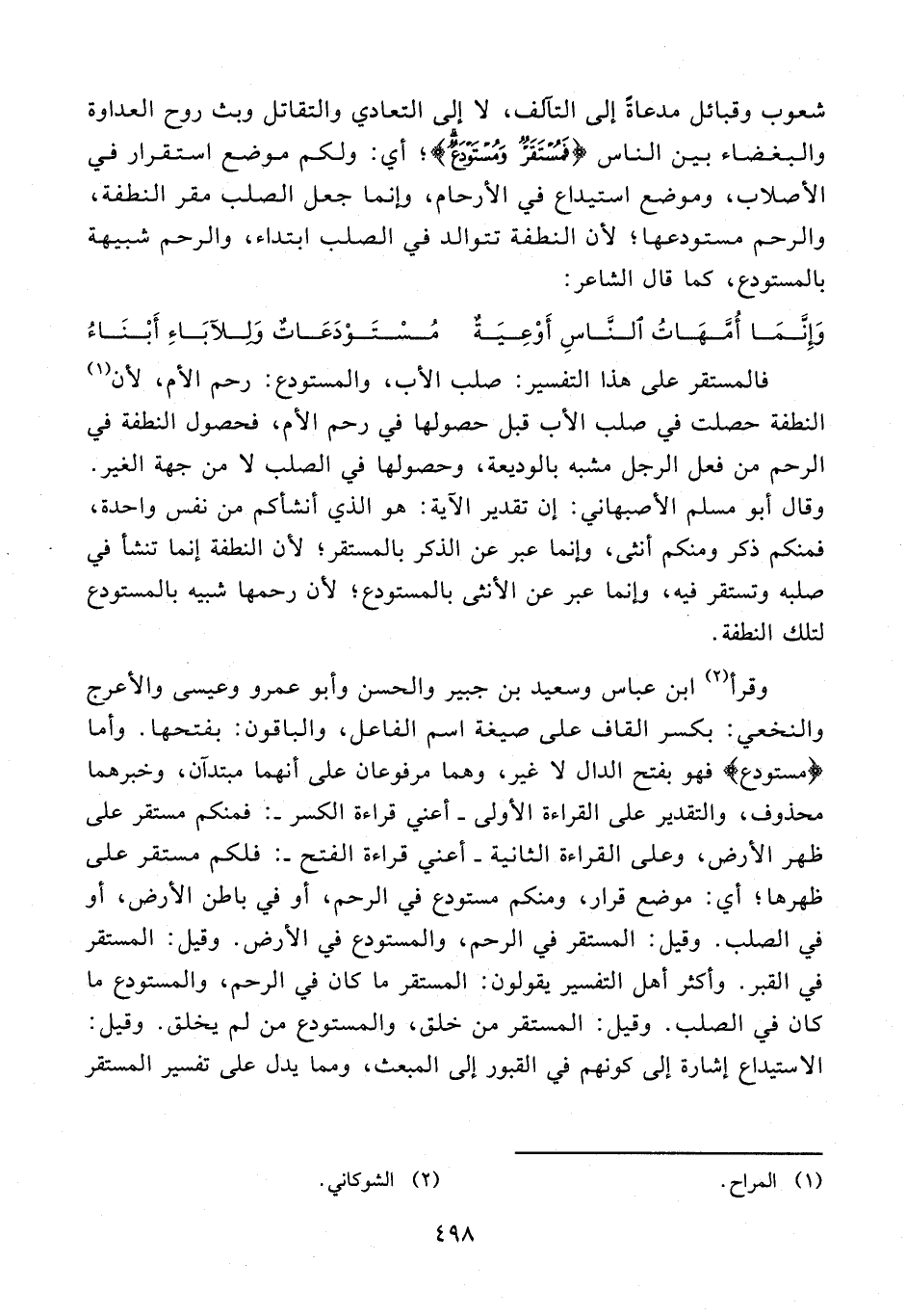 شعوب وقبائل مدعاةً إلى التآلف، لا إلى التعادي والتقاتل وبث روح العداوة والبغضاء بين الناس {فَمُسْتَقَرٌّ وَمُسْتَوْدَعٌ}؛ أي: ولكم موضع استقرار في الأصلاب، وموضع استيداع في الأرحام، وإنما جعل الصلب مقر النطفة، والرحم مستودعها؛ لأن النطفة تتوالد في الصلب ابتداء، والرحم شبيهة بالمستودع، كما قال الشاعر: