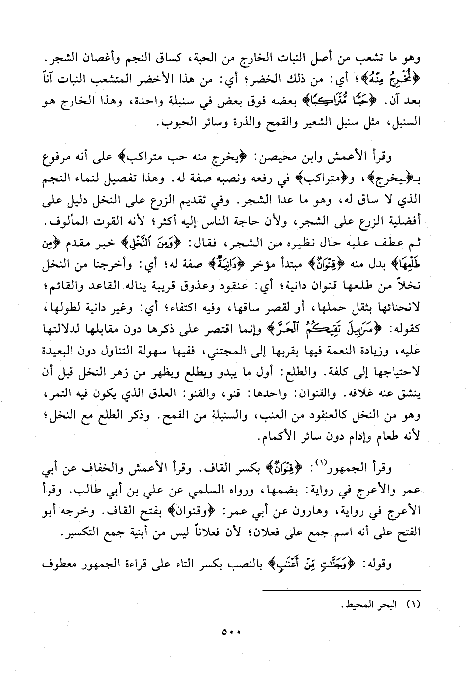 وقرأ الأعمش وابن محيصن: {يخرج منه حب متراكب} على أنه مرفوع بـ {ـيخرج}، و {متراكب} في رفعه ونصبه صفة له. وهذا تفصيل لنماء النجم الذي لا ساق له، وهو ما عدا الشجر. وفي تقديم الزرع على النخل دليل على أفضلية الزرع على الشجر، ولأن حاجة الناس إليه أكثر؛ لأنه القوت المألوف. ثم عطف عليه حال نظيره من الشجر، فقال: {وَمِنَ النَّخْلِ} خبر مقدم {مِنْ طَلْعِهَا} بدل منه {قِنْوَانٌ} مبتدأ مؤخر {دَانِيَةٌ} صفة له؛ أي: وأخرجنا من النخل نخلًا من طلعها قنوان دانية؛ أي: عنقود وعذوق قريبة يناله القاعد والقائم؛ لانحنائها بثقل حملها، أو لقصر ساقها، وفيه اكتفاء؛ أي: وغير دانية لطولها، كقوله: {سَرَابِيلَ تَقِيكُمُ الْحَرَّ} وإنما اقتصر على ذكرها دون مقابلها لدلالتها عليه، وزيادة النعمة فيها بقربها إلى المجتني، ففيها سهولة التناول دون البعيدة لاحتياجها إلى كلفة. والطلع: أول ما يبدو ويطلع ويظهر من زهر النخل قبل أن ينشق عنه غلافه. والقنوان: واحدها: قنو، والقنو: العذق الذي يكون فيه التمر، وهو من النخل كالعنقود من العنب، والسنبلة من القمح. وذكر الطلع مع النخل؛ لأنه طعام وإدام دون سائر الأكمام.