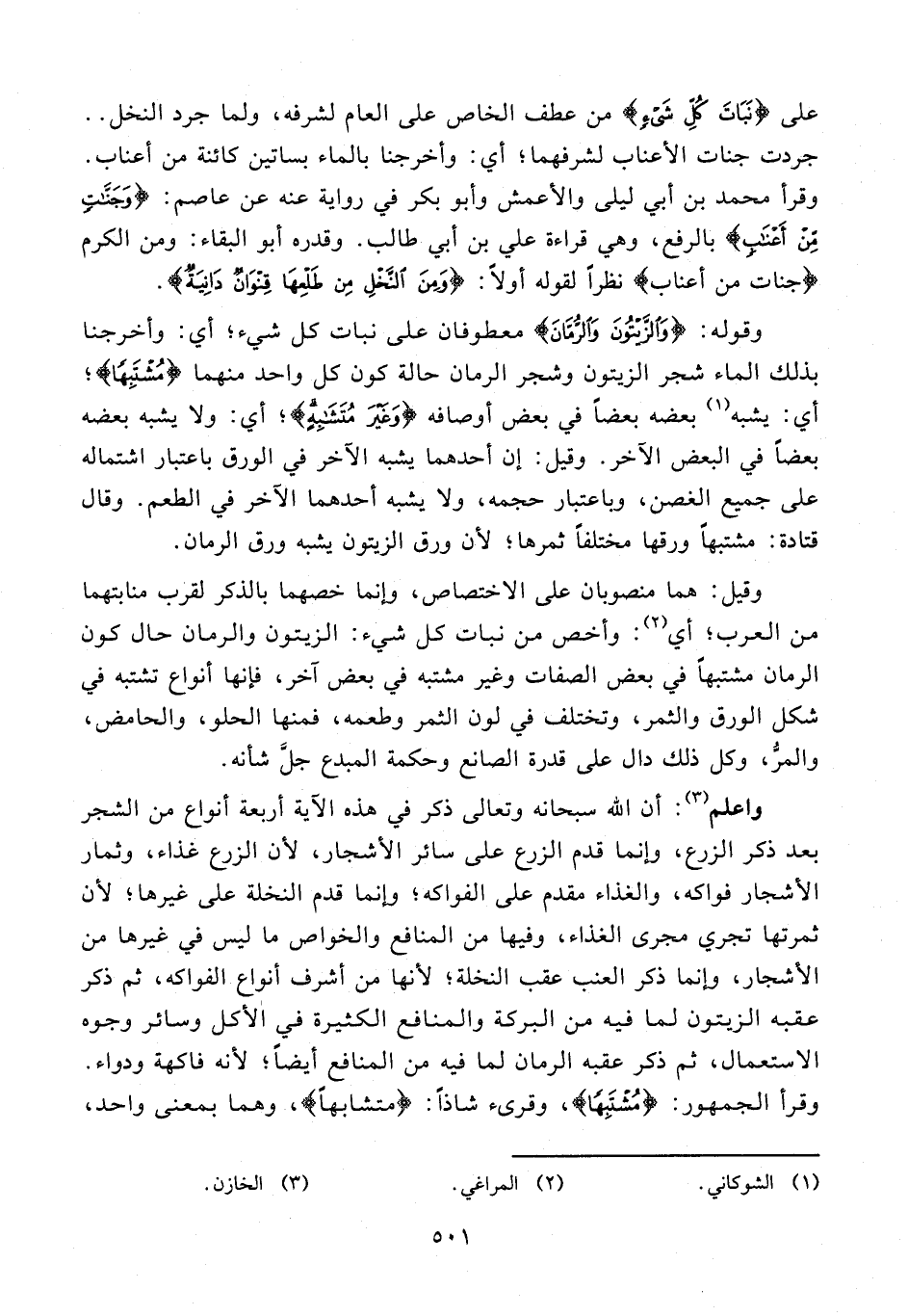 وقوله: {وَالزَّيْتُونَ وَالرُّمَّانَ} معطوفان على نبات كل شيء؛ أي: وأخرجنا بذلك الماء شجر الزيتون وشجر الرمان حالة كون كل واحد منهما {مُشْتَبِهًا}؛ أي: يشبه (¬1) بعضه بعضًا في بعض أوصافه {وَغَيْرَ مُتَشَابِهٍ}؛ أي: ولا يشبه بعضه بعضًا في البعض الآخر. وقيل: إن أحدهما يشبه الآخر في الورق باعتبار اشتماله على جميع الغصن، وباعتبار حجمه، ولا يشبه أحدهما الآخر في الطعم. وقال قتادة: مشتبهًا ورقها مختلفًا ثمرها؛ لأن ورق الزيتون يشبه ورق الرمان.