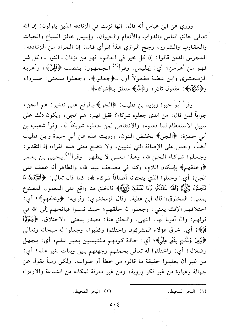 وروي عن ابن عباس أنه قال: إنها نزلت في الزنادقة الذين يقولون: إن الله تعالى خالق الناس والدواب والأنعام والحيوان، وإبليس خالق السباع والحيات والعقارب والشرور، رجح الرازي هذا الرأي قال: إن المراد من الزنادقة: المجوس الذين قالوا: إن كل خير في العالم، فهو من يزدان - النور - وكل شر فهو من أهرمن؛ أي: إبليس. وقرأ (¬1) الجمهور: بنصب {الْجِنَّ}، وأعربه الزمخشري وابن عطية مفعولاً أول لـ {جَعَلُوا}، وجعلوا بمعنى: صيروا، و {شُرَكَاءَ}: مفعول ثانٍ، و {لِلَّهِ} متعلق بـ {شُرَكَاءَ}.
