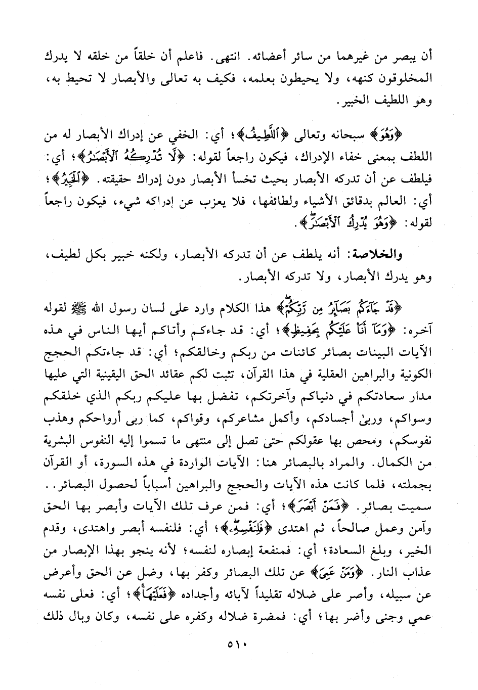 أن يبصر من غيرهما من سائر أعضائه. انتهى. فاعلم أن خلقًا من خلقه لا يدرك المخلوقون كنهه، ولا يحيطون بعلمه، فكيف به تعالى والأبصار لا تحيط به، وهو اللطيف الخبير.