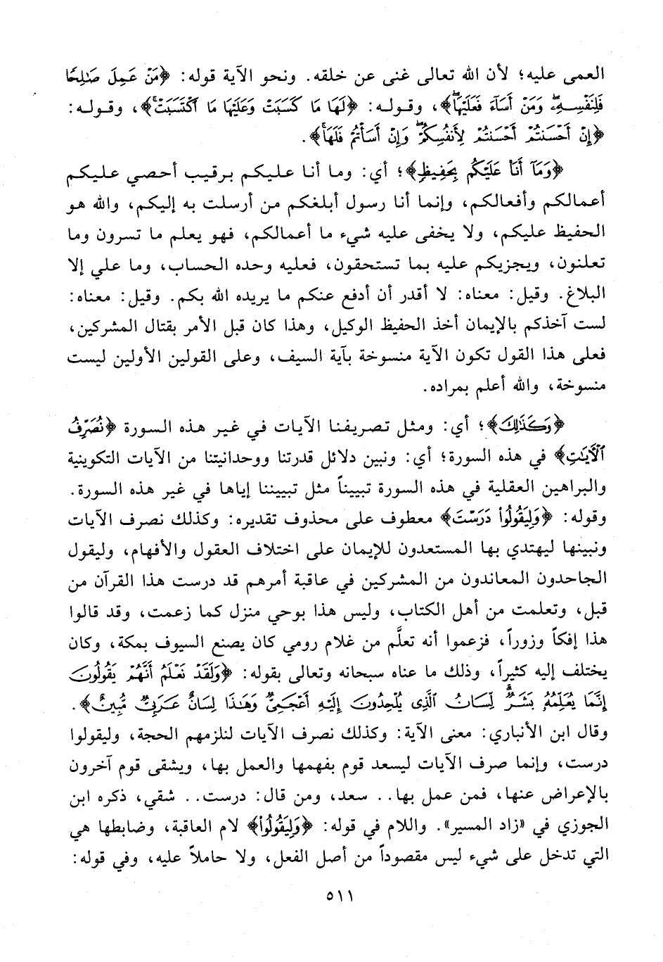 105 - {وَكَذَلِكَ}؛ أي: ومثل تصريفنا الآيات في غير هذه السورة {نُصَرِّفُ الْآيَاتِ} في هذه السورة؛ أي: ونبين دلائل قدرتنا ووحدانيتنا من الآيات التكوينية والبراهين العقلية في هذه السورة تبيينًا مثل تبييننا إياها في غير هذه السورة. وقوله: {وَلِيَقُولُوا دَرَسْتَ} معطوف على محذوف تقديره: وكذلك نصرف الآيات ونبينها ليهتدي بها المستعدون للإيمان على اختلاف العقول والأفهام، وليقول الجاحدون المعاندون من المشركين في عاقبة أمرهم قد درست هذا القرآن من قبل، وتعلمت من أهل الكتاب، وليس هذا بوحي منزل كما زعمت، وقد قالوا هذا إفكًا وزورًا، فزعموا أنه تعلَّم من غلام رومي كان يصنع السيوف بمكة، وكان يختلف إليه كثيرًا، وذلك ما عناه سبحانه وتعالى بقوله: {وَلَقَدْ نَعْلَمُ أَنَّهُمْ يَقُولُونَ إِنَّمَا يُعَلِّمُهُ بَشَرٌ لِسَانُ الَّذِي يُلْحِدُونَ إِلَيْهِ أَعْجَمِيٌّ وَهَذَا لِسَانٌ عَرَبِيٌّ مُبِينٌ}. وقال ابن الأنباري: معنى الآية: وكذلك نصرف الآيات لنلزمهم الحجة، وليقولوا درست، وإنما صرف الآيات ليسعد قوم بفهمها والعمل بها، ويشقى قوم آخرون بالإعراض عنها، فمن عمل بها .. سعد، ومن قال: درست .. شقي، ذكره ابن الجوزي في "زاد المسير". واللام في قوله: {وَلِيَقُولُوا} لام العاقبة، وضابطها هي التي تدخل على شيء ليس مقصودًا من أصل الفعل، ولا حاملًا عليه، وفي قوله: