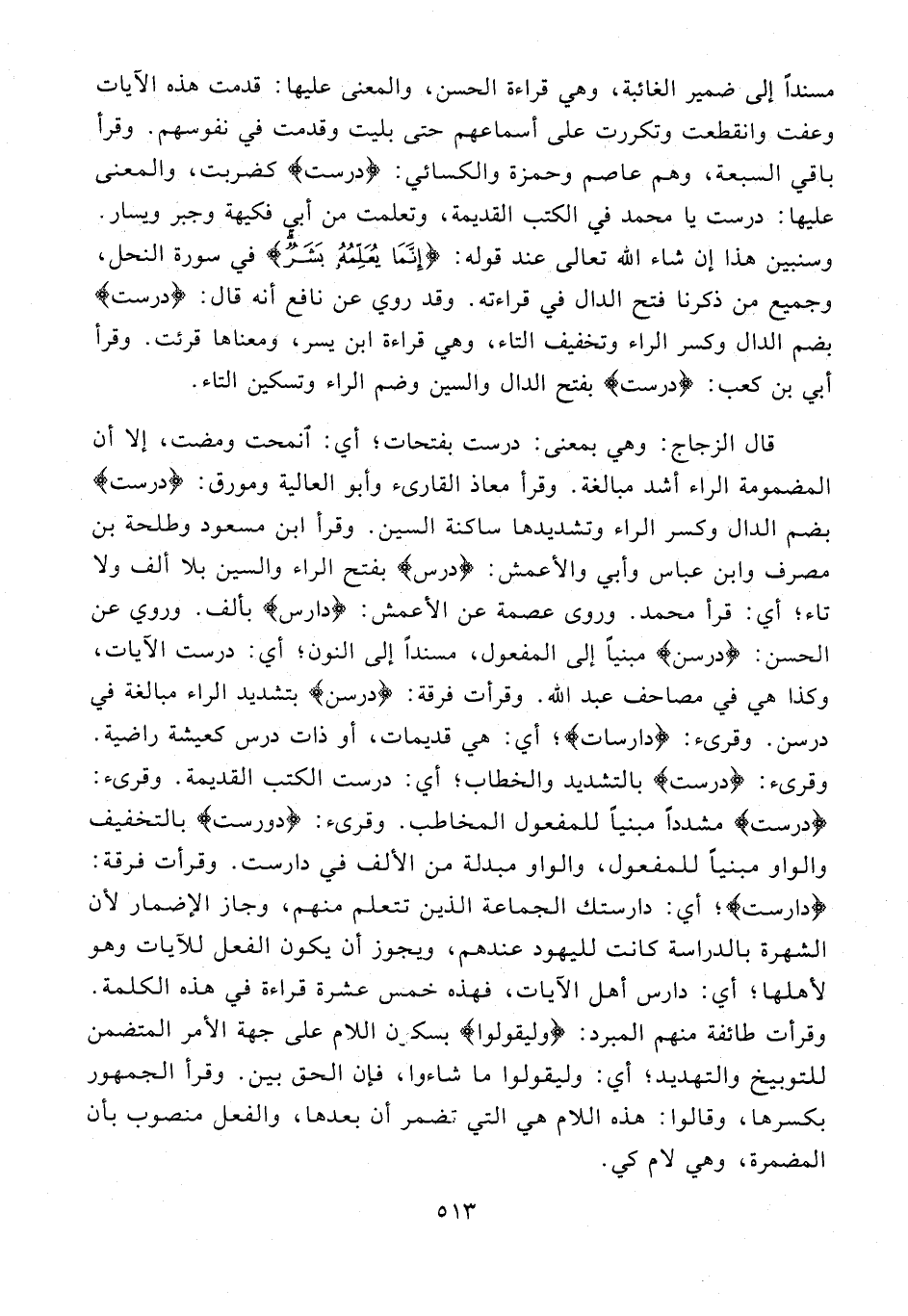 قال الزجاج: وهي بمعنى: درست بفتحات؛ أي: انمحت ومضت، إلا أن المضمومة الراء أشد مبالغة. وقرأ معاذ القارئ وأبو العالية ومورق: {دُرِّسْت} بضم الدال وكسر الراء وتشديدها ساكنة السين. وقرأ ابن مسعود وطلحة بن مصرف وابن عباس وأبي والأعمش: {دَرَس} بفتح الراء والسين بلا ألف ولا تاء؛ أي: قرأ محمد. وروى عصمة عن الأعمش: {دارس} بألف. وروي عن الحسن: {درسن} مبنيًّا إلى المفعول، مسندًا إلى النون؛ أي: درست الآيات، وكذا هي في مصاحف عبد الله. وقرأت فرقة: {درسن} بتشديد الراء مبالغة في درسن. وقرىء: {دارسات}؛ أي: هي قديمات، أو ذات درس كعيشة راضية. وقرىء: {درست} بالتشديد والخطاب؛ أي: درست الكتب القديمة. وقرىء: {درست} مشددًا مبنيًّا للمفعول المخاطب. وقرىء: {دورست} بالتخفيف والواو مبنيًّا للمفعول، والواو مبدلة من الألف في دارست. وقرأت فرقة: {دارست}؛ أي: دارستك الجماعة الذين تتعلم منهم، وجاز الإضمار لأن الشهرة بالدراسة كانت لليهود عندهم، ويجوز أن يكون الفعل للآيات وهو لأهلها؛ أي: دارس أهل الآيات، فهذه خمس عشرة قراءة في هذه الكلمة. وقرأت طائفة منهم المبرد: {وليقولوا} بسكون اللام على جهة الأمر المتضمن للتوبيخ والتهديد؛ أي: وليقولوا ما شاءوا، فإن الحق بين. وقرأ الجمهور بكسرها، وقالوا: هذه اللام هي التي تضمر أن بعدها، والفعل منصوب بأن المضمرة، وهي لام كي.