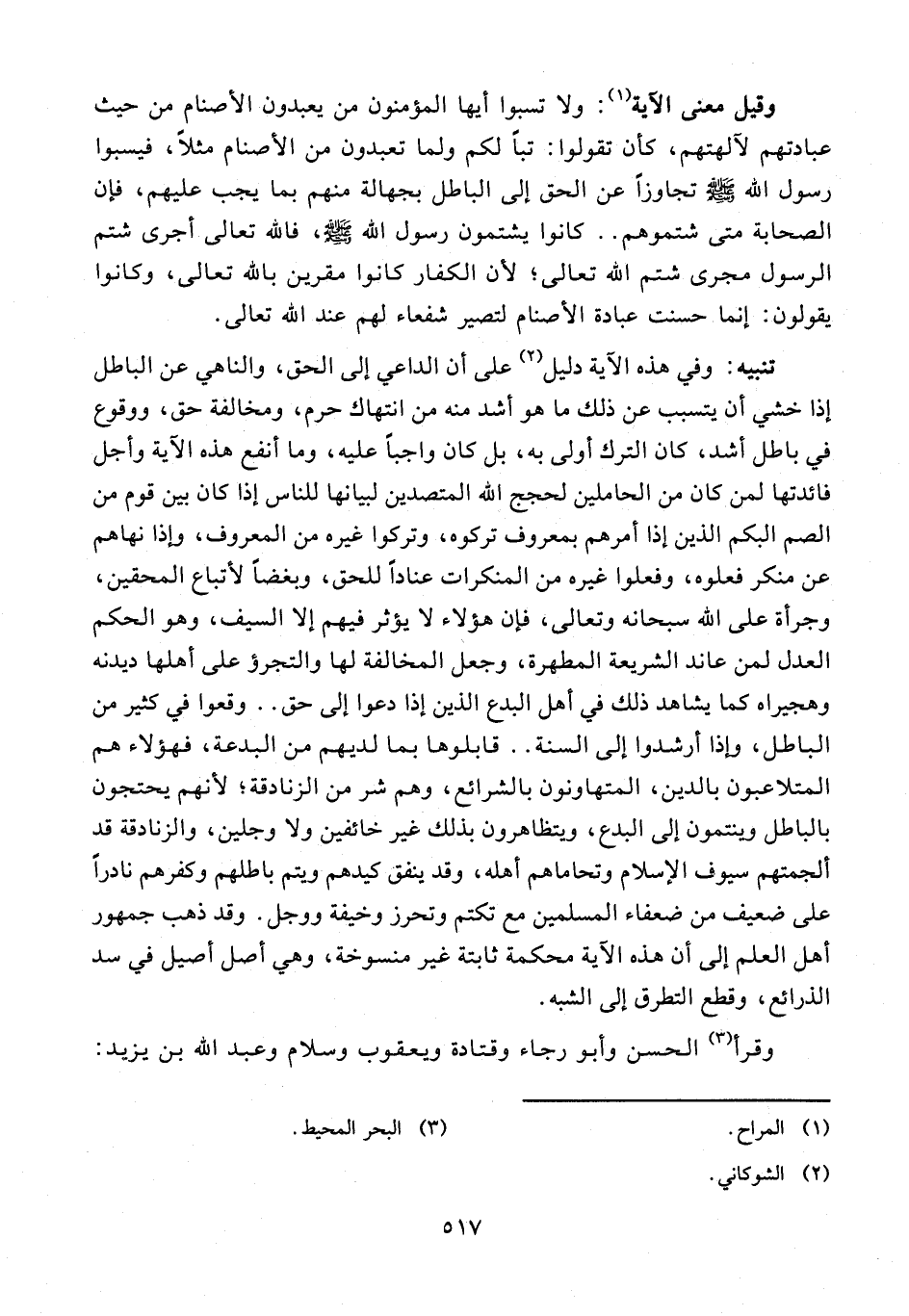 تنبيه: وفي هذه الآية دليل (¬2) على أن الداعي إلى الحق، والناهي عن الباطل إذا خشي أن يتسبب عن ذلك ما هو أشد منه من انتهاك حرم، ومخالفة حق، ووقوع في باطل أشد، كان الترك أولى به، بل كان واجبًا عليه، وما أنفع هذه الآية وأجل فائدتها لمن كان من الحاملين لحجج الله المتصدين لبيانها للناس إذا كان بين قوم من الصم البكم الذين إذا أمرهم بمعروف تركوه، وتركوا غيره من المعروف، وإذا نهاهم عن منكر فعلوه، وفعلوا غيره من المنكرات عنادًا للحق، وبغضًا لأتباع المحقين، وجرأة على الله سبحانه وتعالى، فإن هؤلاء لا يؤثر فيهم إلا السيف، وهو الحكم العدل لمن عاند الشريعة المطهرة، وجعل المخالفة لها والتجرؤ على أهلها ديدنه وهجيراه كما يشاهد ذلك في أهل البدع الذين إذا دعوا إلى حق .. وقعوا في كثير من الباطل، وإذا أرشدوا إلى السنة .. قابلوها بما لديهم من البدعة، فهؤلاء هم المتلاعبون بالدين، المتهاونون بالشرائع، وهم شر من الزنادقة؛ لأنهم يحتجون بالباطل وينتمون إلى البدع، ويتظاهرون بذلك غير خائفين ولا وجلين، والزنادقة قد ألجمتهم سيوف الإِسلام وتحاماهم أهله، وقد ينفق كيدهم ويتم باطلهم وكفرهم نادرًا على ضعيف من ضعفاء المسلمين مع تكتم وتحرز وخيفة ووجل. وقد ذهب جمهور أهل العلم إلى أن هذه الآية محكمة ثابتة غير منسوخة، وهي أصل أصيل في سد الذرائع، وقطع التطرق إلى الشبه.
