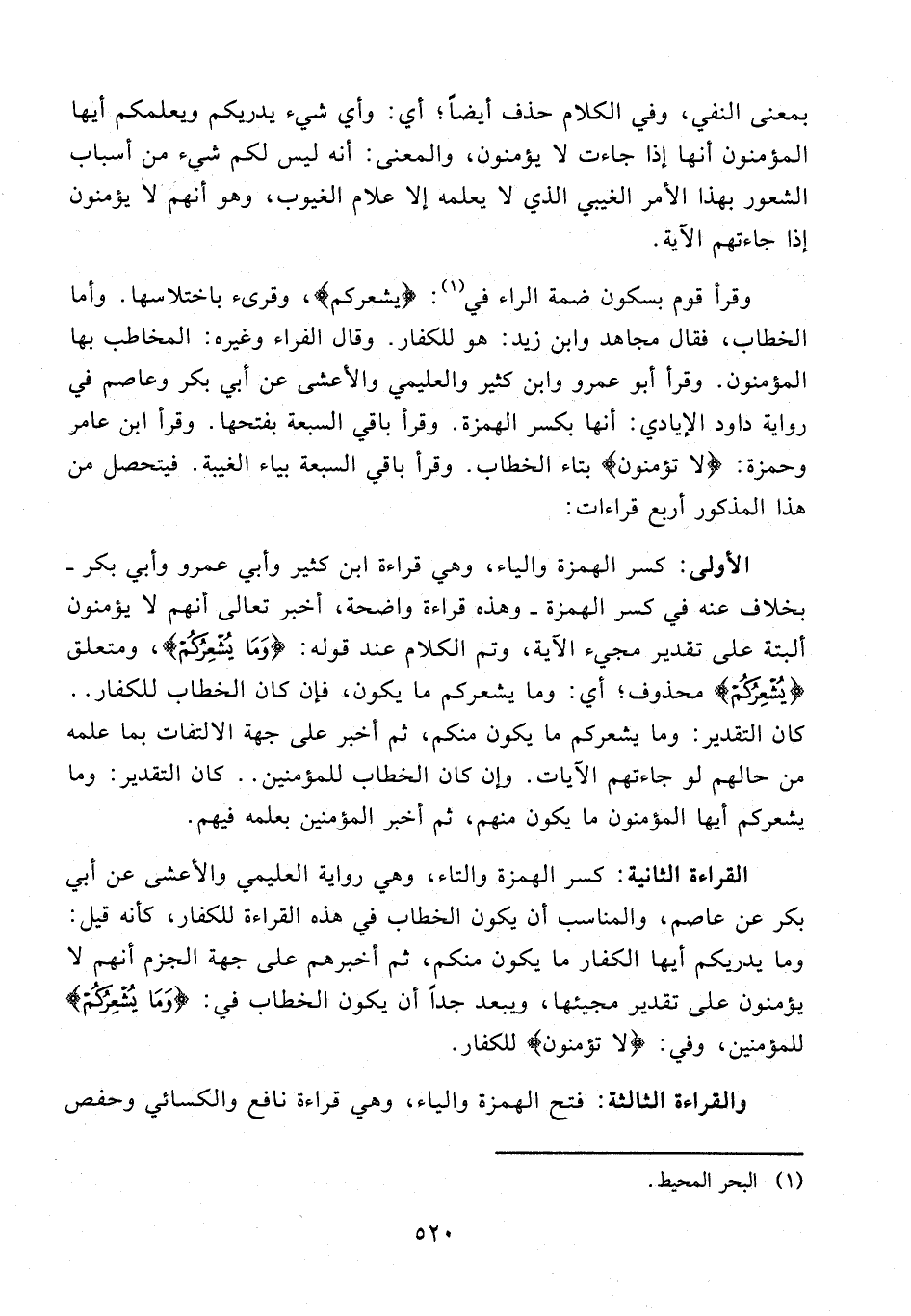 الأولى: كسر الهمزة والياء، وهي قراءة ابن كثير وأبي عمرو وأبي بكر - بخلاف عنه في كسر الهمزة - وهذه قراءة واضحة، أخبر تعالى أنهم لا يؤمنون ألبتة على تقدير مجيء الآية، وتم الكلام عند قوله: {يُشْعِرُكُمْ}، ومتعلق {يُشْعِرُكُمْ} محذوف؛ أي: وما يشعركم ما يكون، فإن كان الخطاب للكفار .. كان التقدير: وما يشعركم ما يكون منكم، ثم أخبر على جهة الالتفات بما علمه من حالهم لو جاءتهم الآيات. وإن كان الخطاب للمؤمنين .. كان التقدير: وما يشعركم أيها المؤمنون ما يكون منهم، ثم أخبر المؤمنين بعلمه فيهم.
