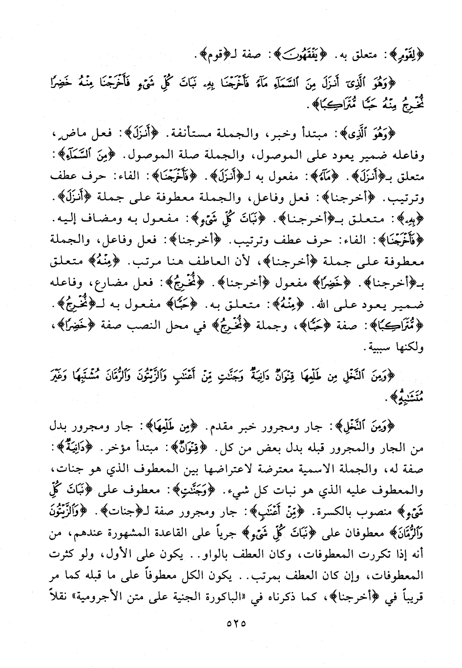 {وَمِنَ النَّخْلِ}: جار ومجرور خبر مقدم. {مِنْ طَلْعِهَا}: جار ومجرور بدل من الجار والمجرور قبله بدل بعض من كل. {قِنْوَانٌ}: مبتدأ مؤخر. {دَانِيَةٌ}: صفة له، والجملة الإسمية معترضة لاعتراضها بين المعطوف الذي هو جنات، والمعطوف عليه الذي هو نبات كل شيء. {وَجَنَّاتٍ}: معطوف على {نَبَاتَ كُلِّ شَيْءٍ} منصوب بالكسرة. {مِنْ أَعْنَابٍ}: جار ومجرور صفة لـ {جَنَّاتٍ}. {وَالزَّيْتُونَ وَالرُّمَّانَ} معطوفان على {نَبَاتَ كُلِّ شَيْءٍ} جريًا على القاعدة المشهورة عندهم، من أنه إذا تكررت المعطوفات، وكان العطف بالواو .. يكون على الأول، ولو كثرت المعطوفات، وإن كان العطف بمرتب .. يكون الكل معطوفًا على ما قبله كما مر قريبًا في {أخرجنا}، كما ذكرناه في "الباكورة الجنية على متن الأجرومية" نقلًا