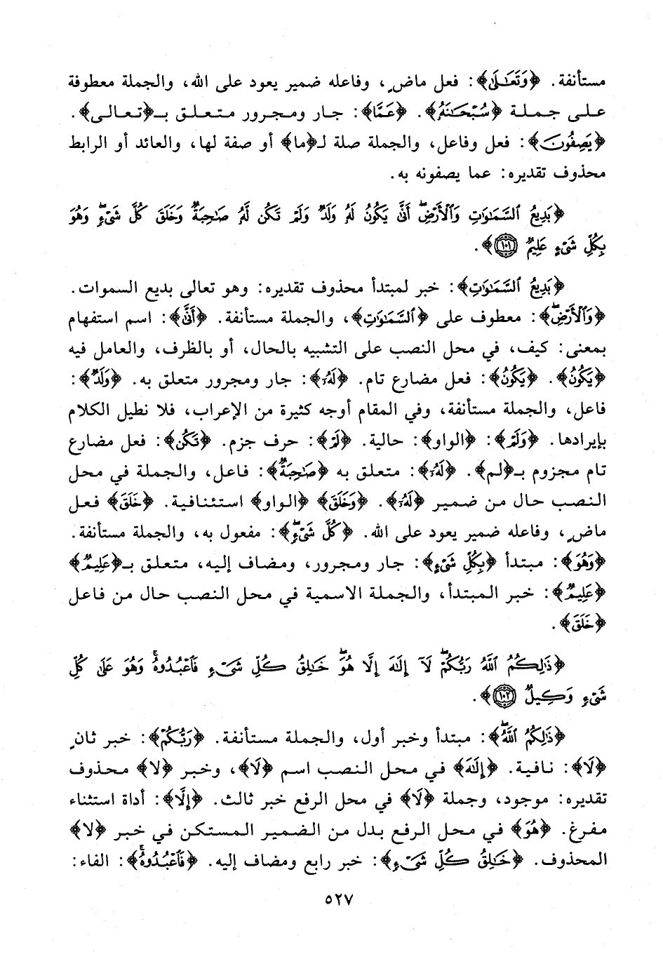 {بَدِيعُ السَّمَاوَاتِ}: خبر لمبتدأ محذوف تقديره: وهو تعالى بديع السموات. {وَالْأَرْضِ}: معطوف على {السَّمَاوَاتِ}، والجملة مستأنفة. {أَنَّى}: اسم استفهام بمعنى: كيف، في محل النصب على التشبيه بالحال، أو بالظرف، والعامل فيه {يَكُونُ}. {يَكُونُ}: فعل مضارع تام. {لَهُ}: جار ومجرور متعلق به. {وَلَدٌ}: فاعل، والجملة مستأنفة، وفي المقام أوجه كثيرة من الإعراب، فلا نطيل الكلام بإيرادها. {وَلَمْ}: {الواو}: حالية. {لَمْ}: حرف جزم. {تَكُنْ}: فعل مضارع تام مجزوم بـ {لم}. {لَهُ}: متعلق به {صَاحِبَةٌ}: فاعل، والجملة في محل النصب حال من ضمير {لَهُ}. {وَخَلَقَ} {الواو} استئنافية. {خَلَقَ} فعل ماضٍ، وفاعله ضمير يعود على الله. {كُلَّ شَيْءٍ}: مفعول به، والجملة مستأنفة. {وَهُوَ}: مبتدأ {بِكُلِّ شَيْءٍ}: جار ومجرور، ومضاف إليه، متعلق بـ {عَلِيمٌ} {عَلِيمٌ}: خبر المبتدأ، والجملة الإسمية في محل النصب حال من فاعل {خَلَقَ}.